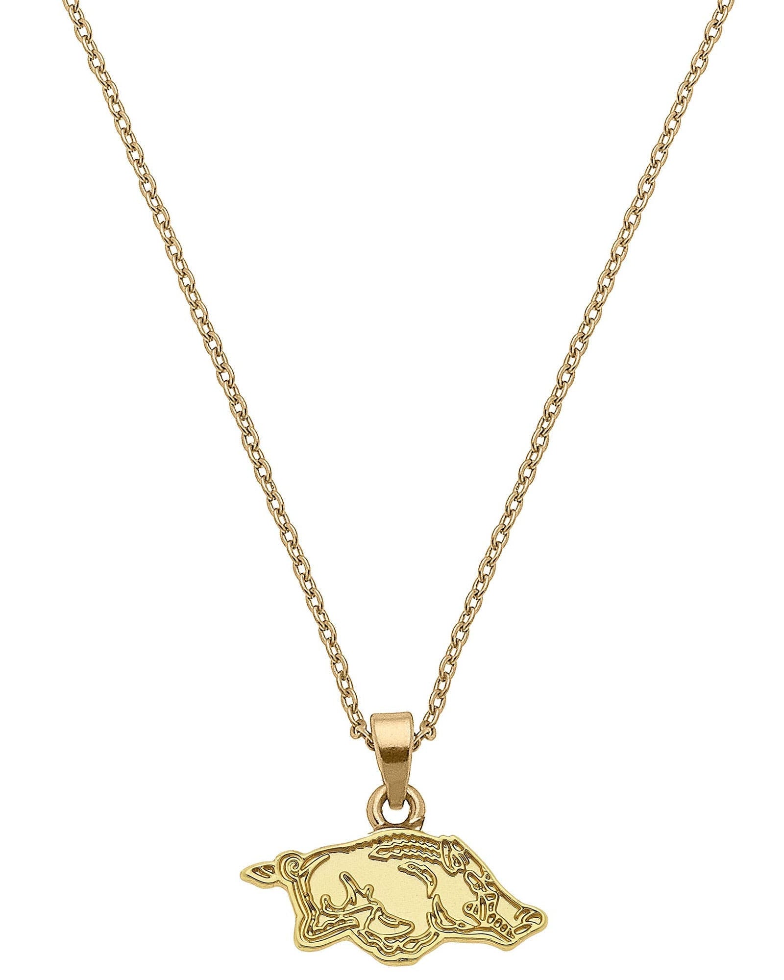 Show off your Razorbacks spirit with this delicate charm necklace! 24K gold plated, accessorize your game day look with this University of Arkansas necklace.