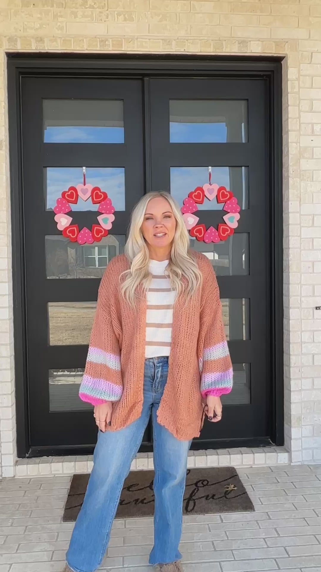 This cozy-meets-playful cardigan is the perfect layering piece to brighten up your everyday look. Featuring a soft peach knit body and statement balloon sleeves with pastel colorblock stripes, this cardigan adds just the right pop of fun while still feeling effortless and wearable.