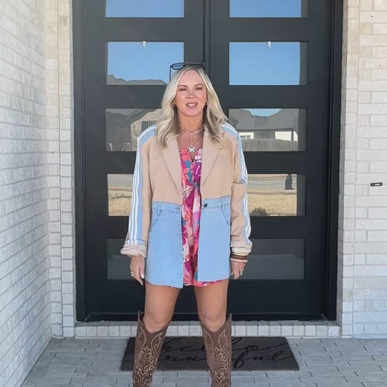 Structured, effortless, and just unexpected enough. The Canyon Line Contrast Blazer blends soft stretch cotton with light-wash denim contrast for a modern western feel. Featuring a tailored lapel collar and mixed-fabric design, this piece gives you the polish of a blazer with the ease of everyday wear.