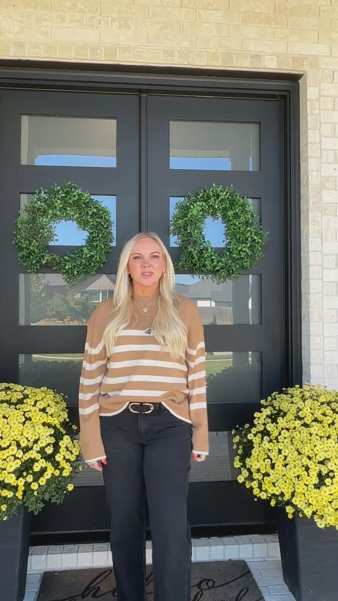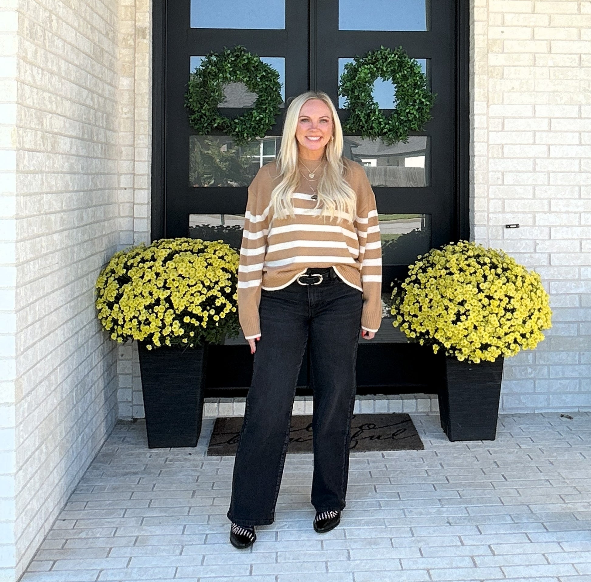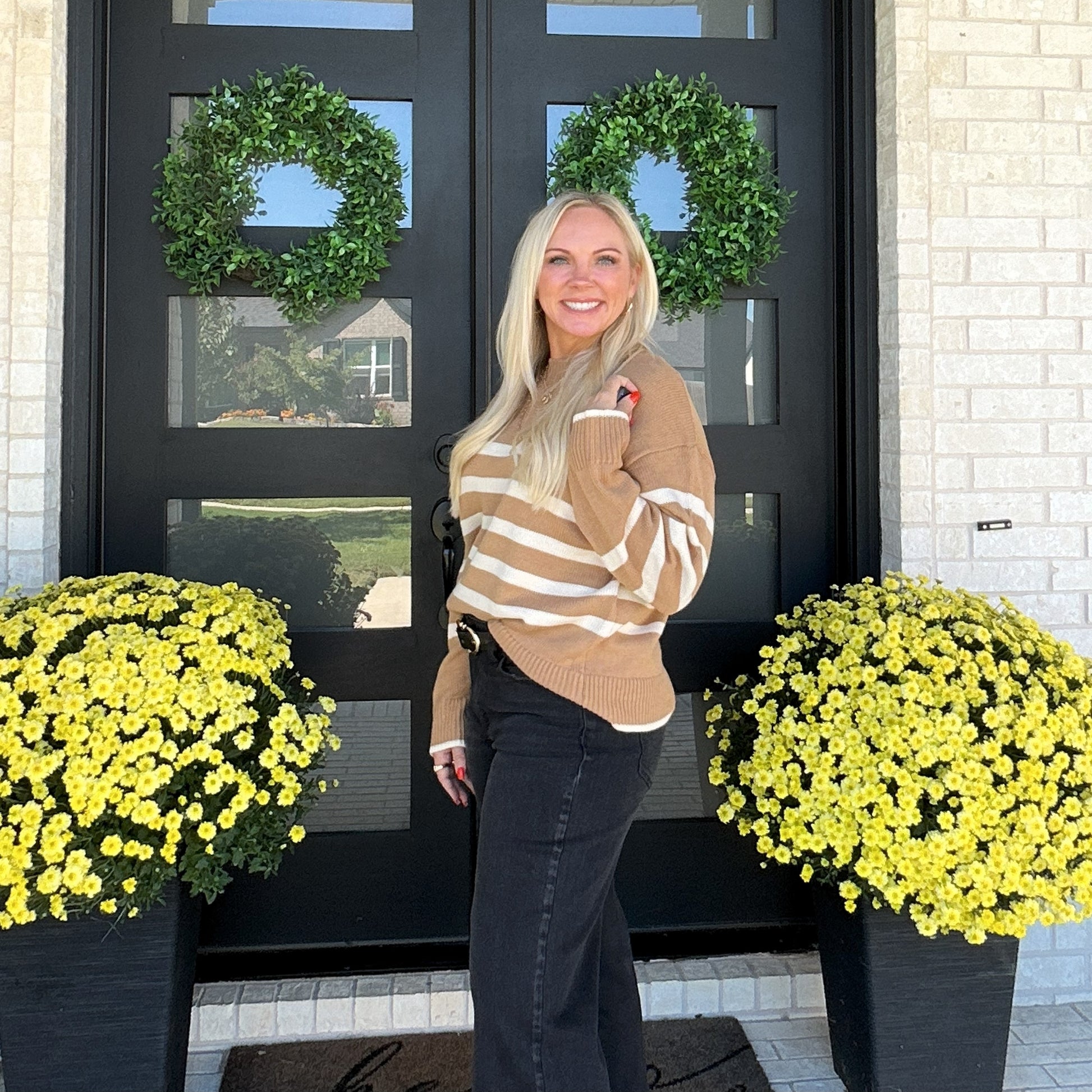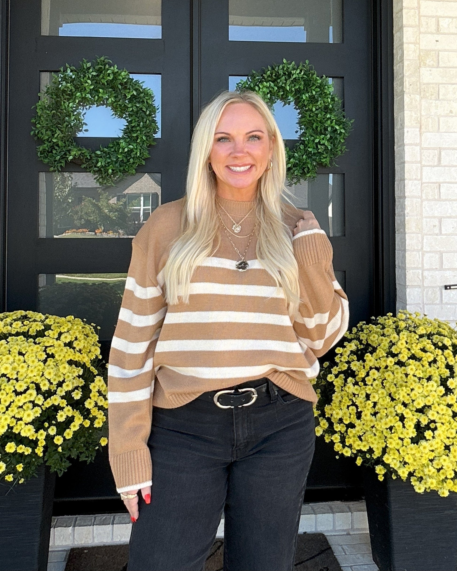 The Caramel Stripe Sweater brings effortless charm to your Harvest Crush collection. With its warm camel hue, classic cream stripes, and soft knit fabric, this sweater is designed for both comfort and style. The relaxed silhouette and crew neckline make it a staple for transitioning seasons.