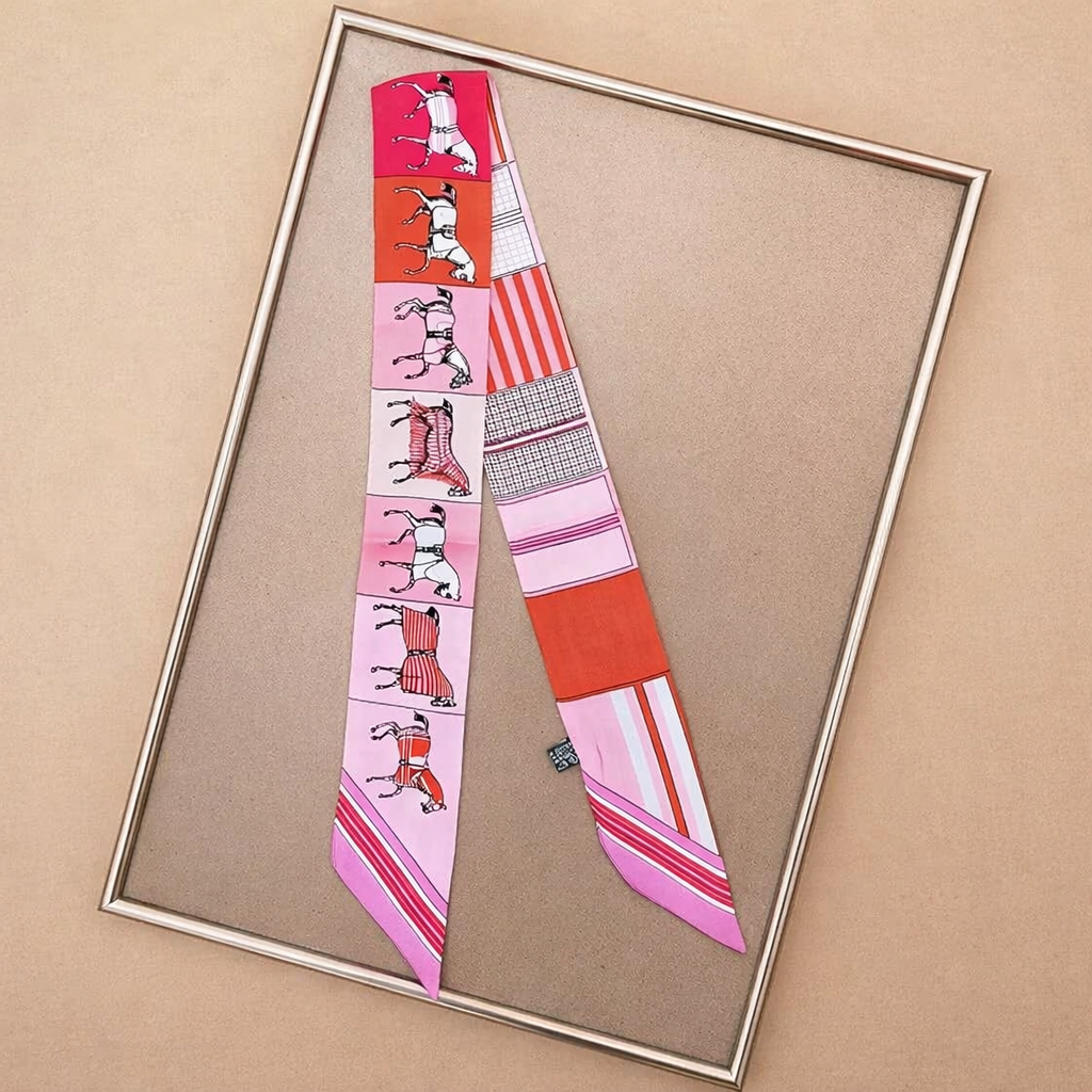 The Carriage Twilly Scarf features a refined equestrian-inspired print in soft pinks and rich red tones. Designed with classic horse motifs and stripe accents, this versatile accessory adds a polished, playful touch to any look. Style it at the neck, in your hair, wrapped around a handbag, or tied at the wrist for effortless charm.