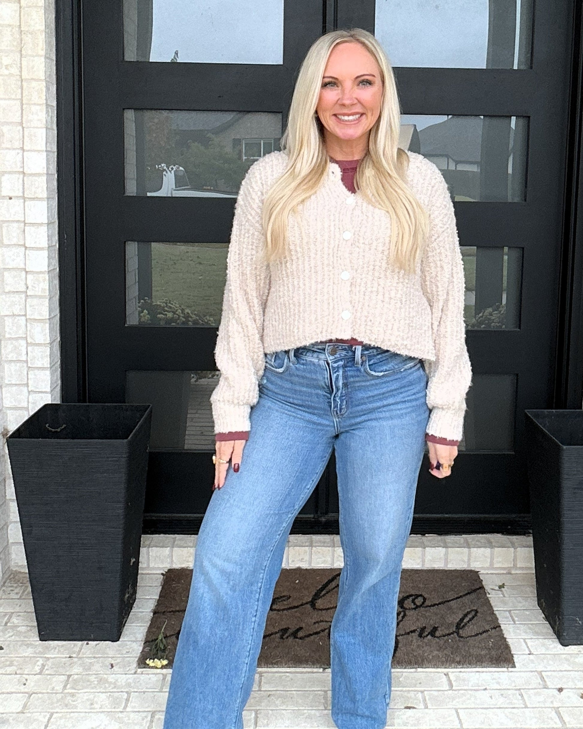 Embrace the cozy appeal of the Cloud Nine Cardi, a fluffy knit sweater crafted from luxuriously soft yarn. Featuring contrasting buttons and a relaxed, slightly cropped fit, it’s the perfect piece for effortless layering. Pair it with high-waisted jeans for a laid-back look or a sleek skirt for a touch of elevated charm. Designed for breezy days and chilly evenings alike, this cardi delivers the ultimate mix of comfort and versatility.