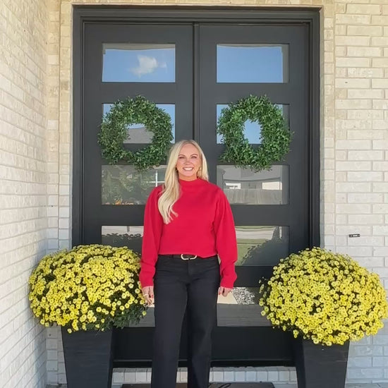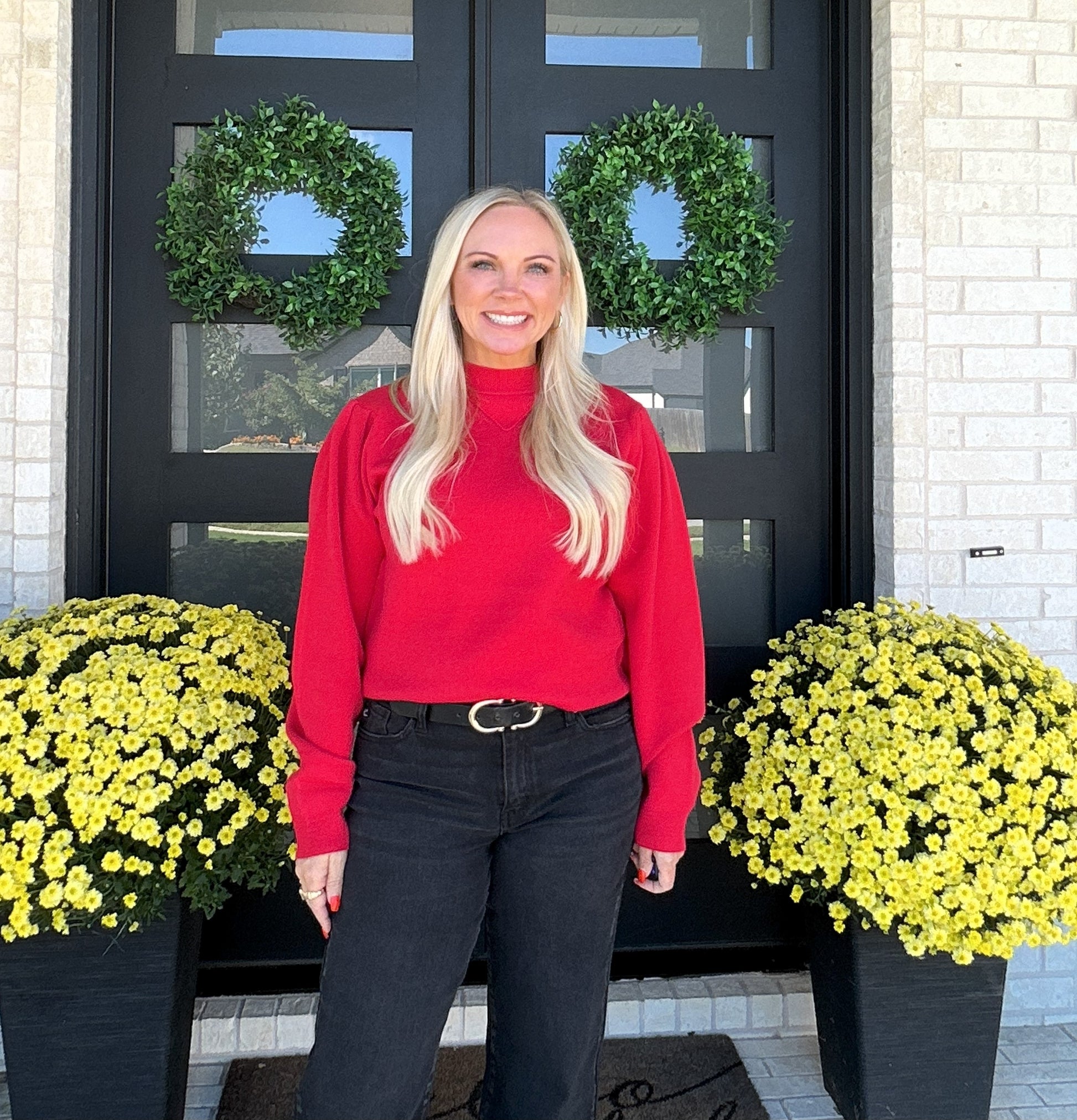 Turn heads in the Crimson Glow Mock-Neck Sweater, designed with a zig-zag ribbed mock neck, gathered puff shoulders, and dramatic long sleeves finished with matching ribbed cuffs. The cozy acrylic-cotton blend offers warmth without bulk, while the flattering ribbed hem makes it easy to half-tuck or wear loose.