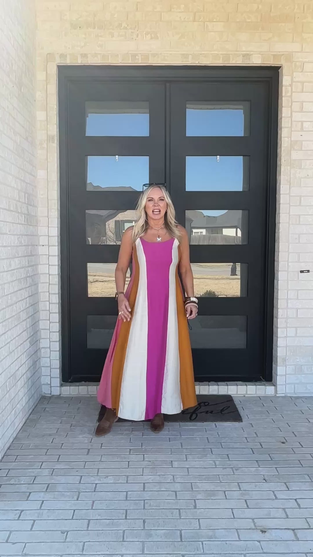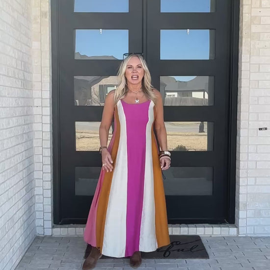 Bold, flowy, and made for golden hour. The Desert Sunset Colorblock Maxi Dress features rich sunset-inspired tones of magenta, mustard, rose, and sand in a flattering vertical panel design. The adjustable straps and smocked back create a comfortable, flexible fit while the flowy silhouette moves beautifully with every step.