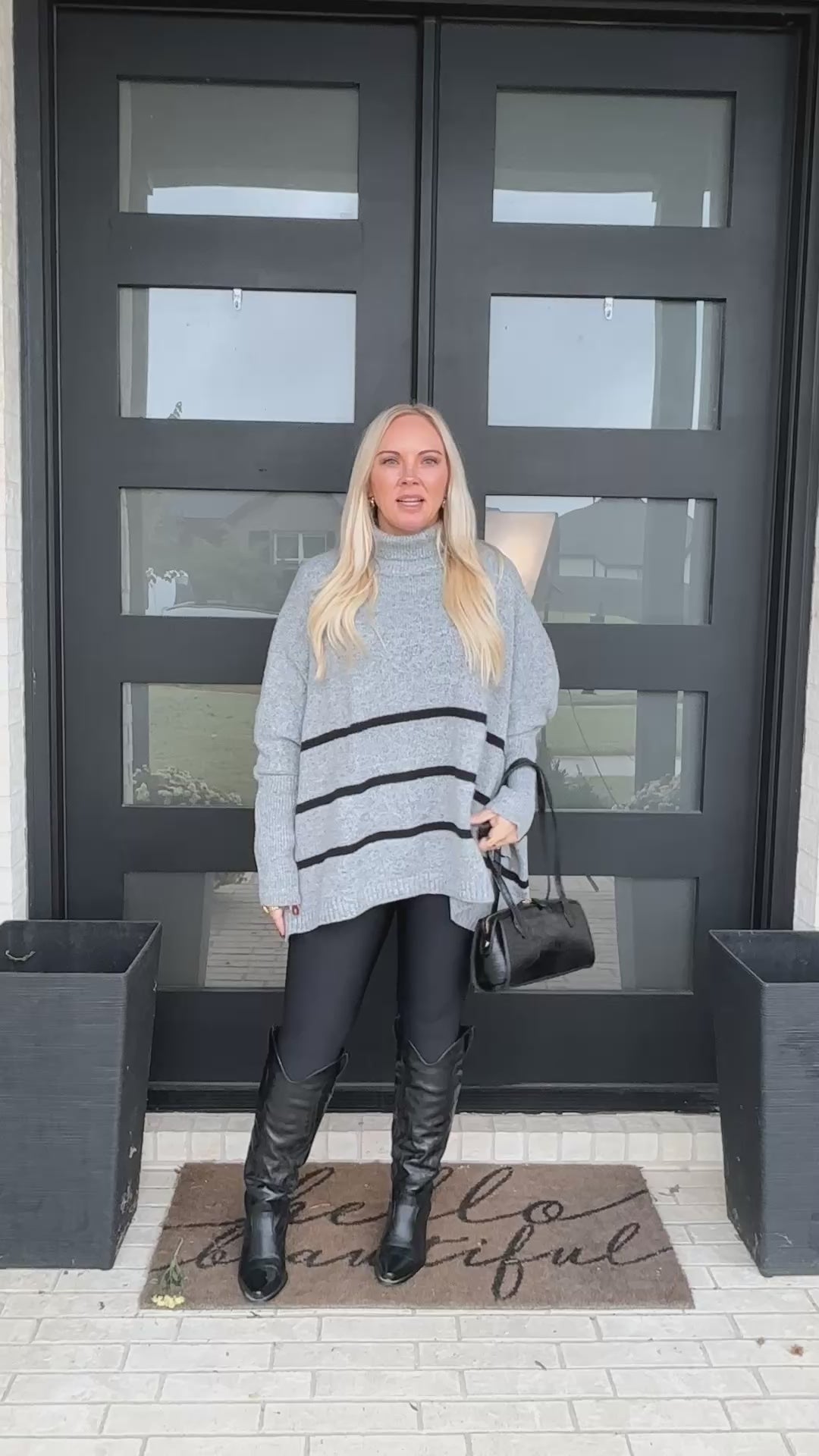 Meet the Frostline Turtleneck Sweater — a cozy oversized knit designed for laid-back days and effortless layering. Crafted from ultra-soft fabric with bold black stripes, this relaxed silhouette features a slouchy turtleneck, drop shoulders, and an easy drape that flatters every figure. Perfect for pairing with leggings and boots for an elevated yet comfortable winter look.