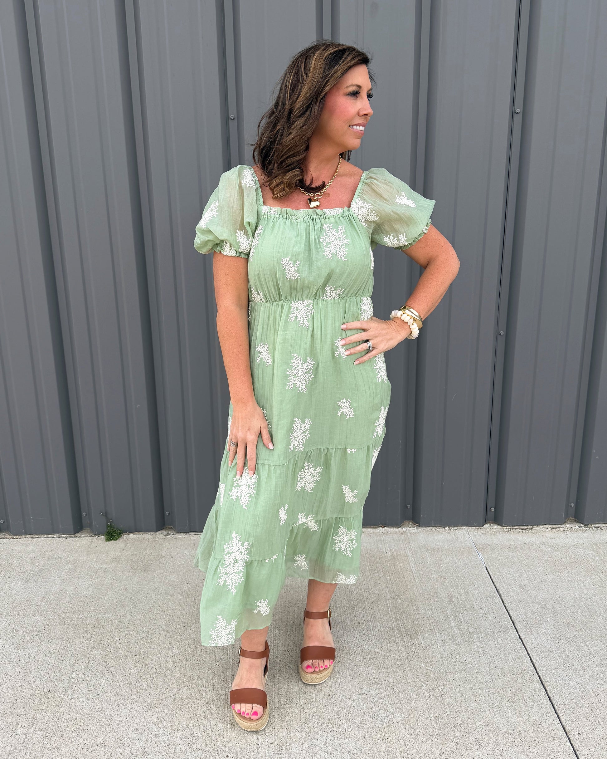 Designed with delicate embroidered detailing throughout, soft puff sleeves, and tiered layers that flow beautifully with every step, this dress blends timeless charm with modern comfort. The square neckline and adjustable neck tie add a flattering, feminine touch, while the full lining keeps it easy and comfortable to wear.