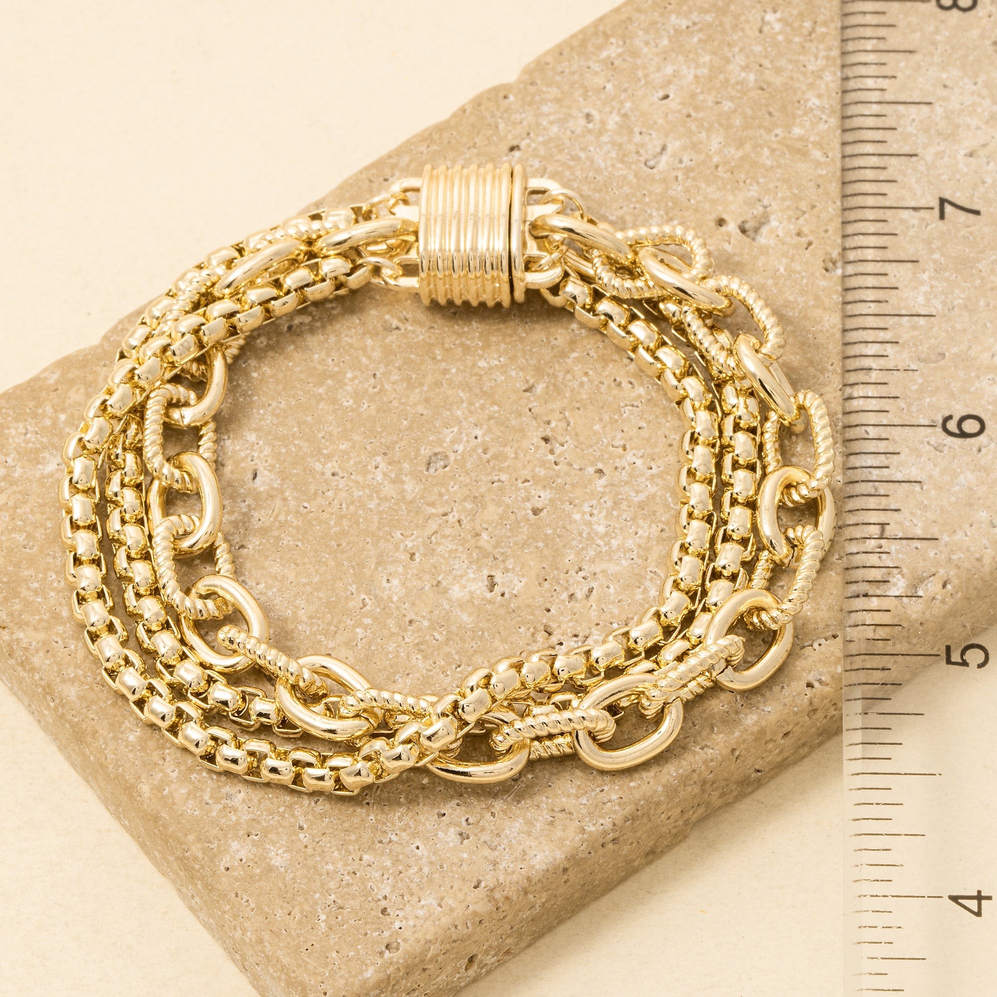 Strike gold with this bold, statement-making chain bracelet. The Gold Rush Magnetic Bracelet features layered assorted chain textures in a rich gold-plated finish, designed to capture that high-noon, frontier-luxe vibe. The secure magnetic clasp makes it effortless to wear while keeping the look elevated and polished.