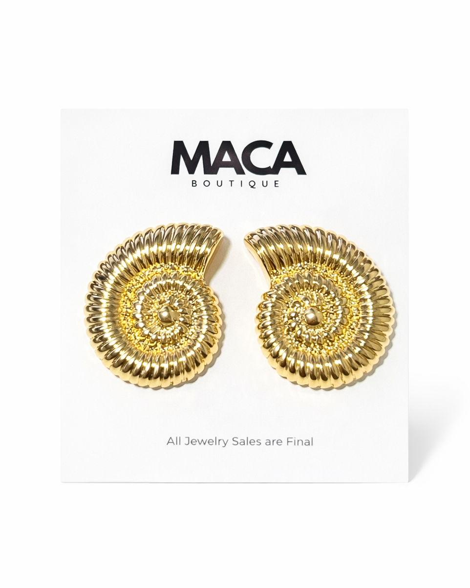Bold yet effortless, the Golden Current Studs feature a sculptural spiral shell design in a radiant high-polish gold finish. Inspired by the movement of ocean currents, these earrings bring refined coastal energy to any look.