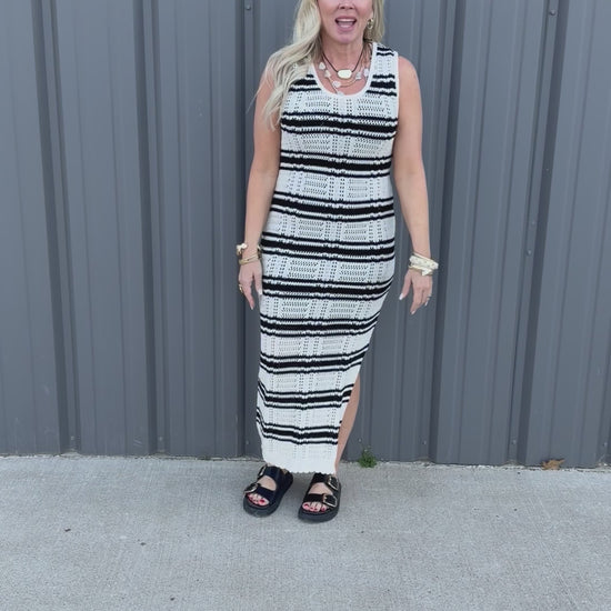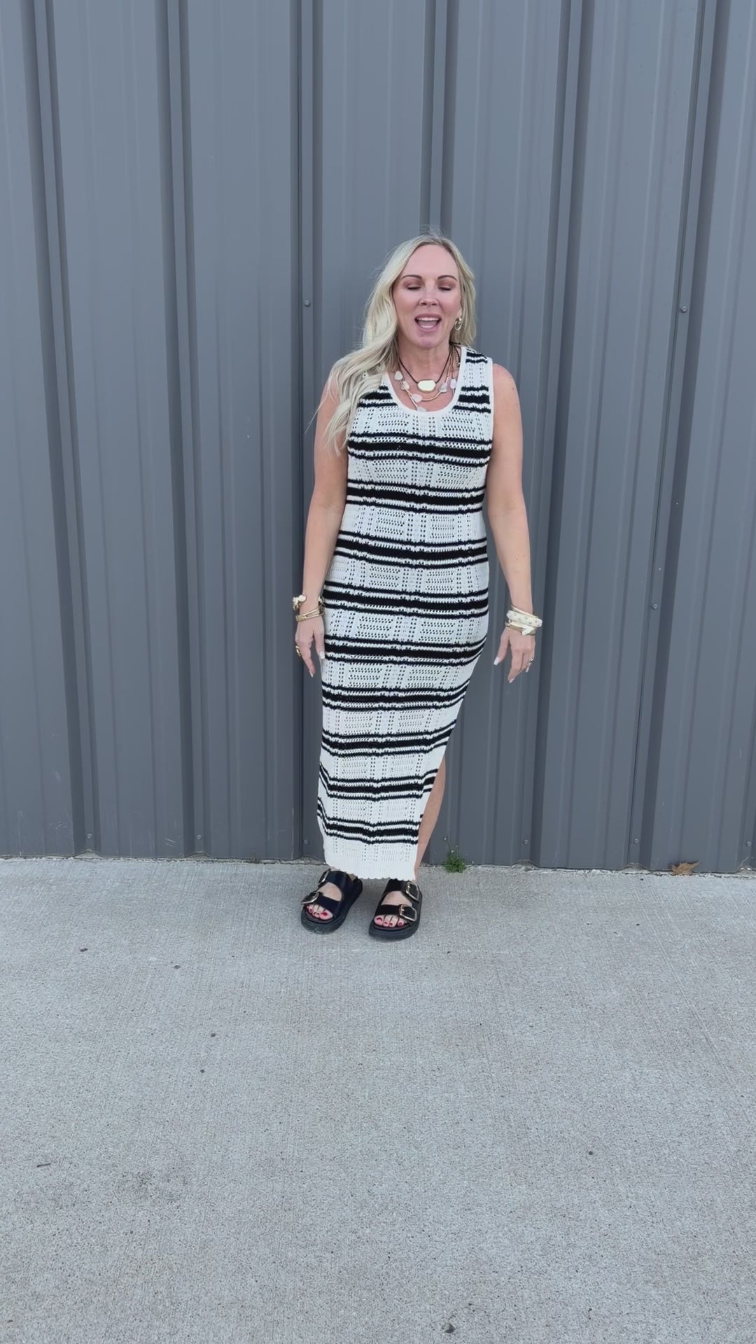 Classic nautical stripes meet effortless comfort in the Harbor Stripe Maxi Dress. Designed in a soft natural knit with bold black striping, this full-length silhouette gives you that relaxed coastal feel while still looking polished and put together.