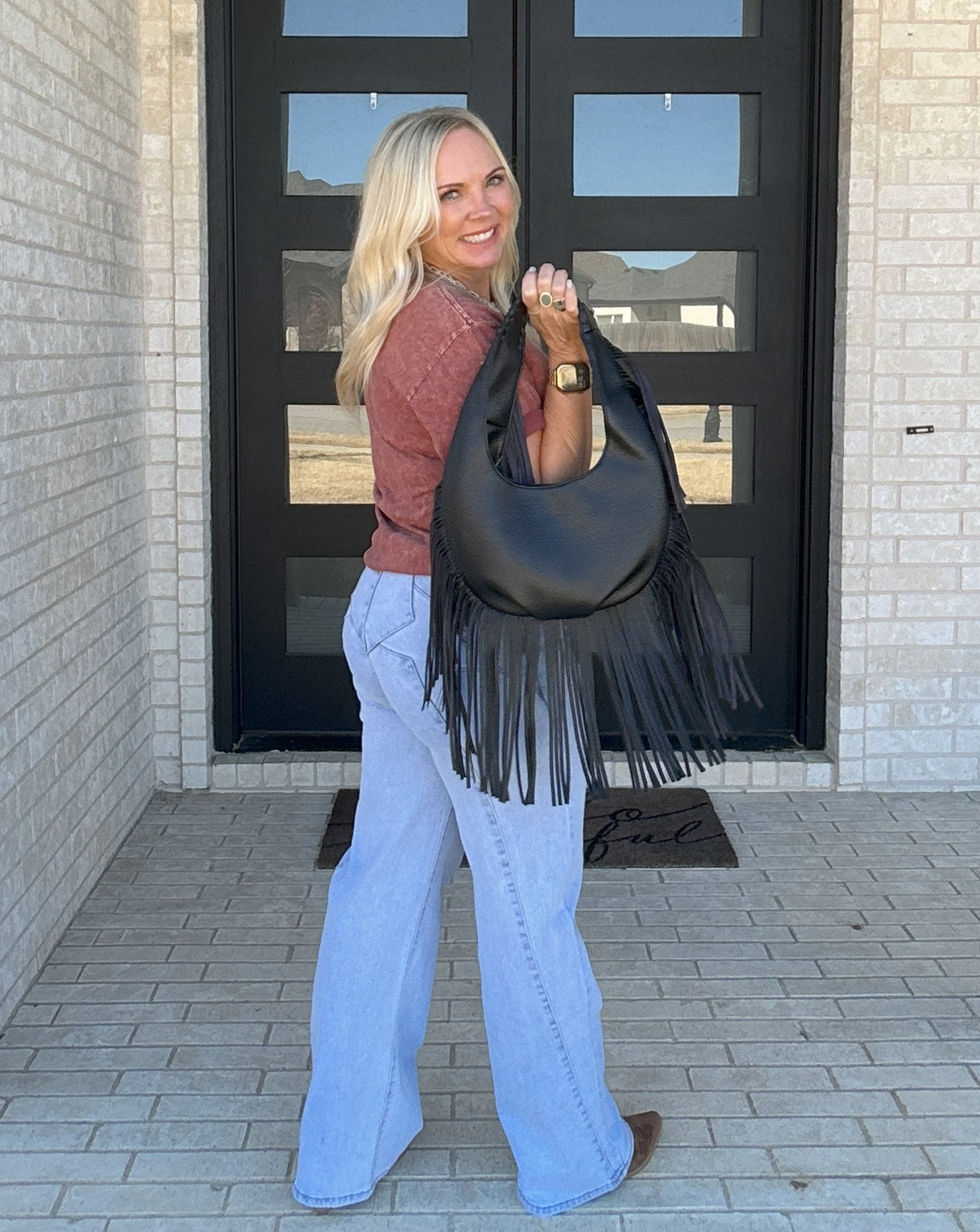 The High Desert Fringe Hobo Bag is the statement accessory your Saddle & Sun outfits have been waiting for. Designed in soft faux vegan leather with dramatic fringe detailing along the sides and bottom, this bag moves beautifully with every step.