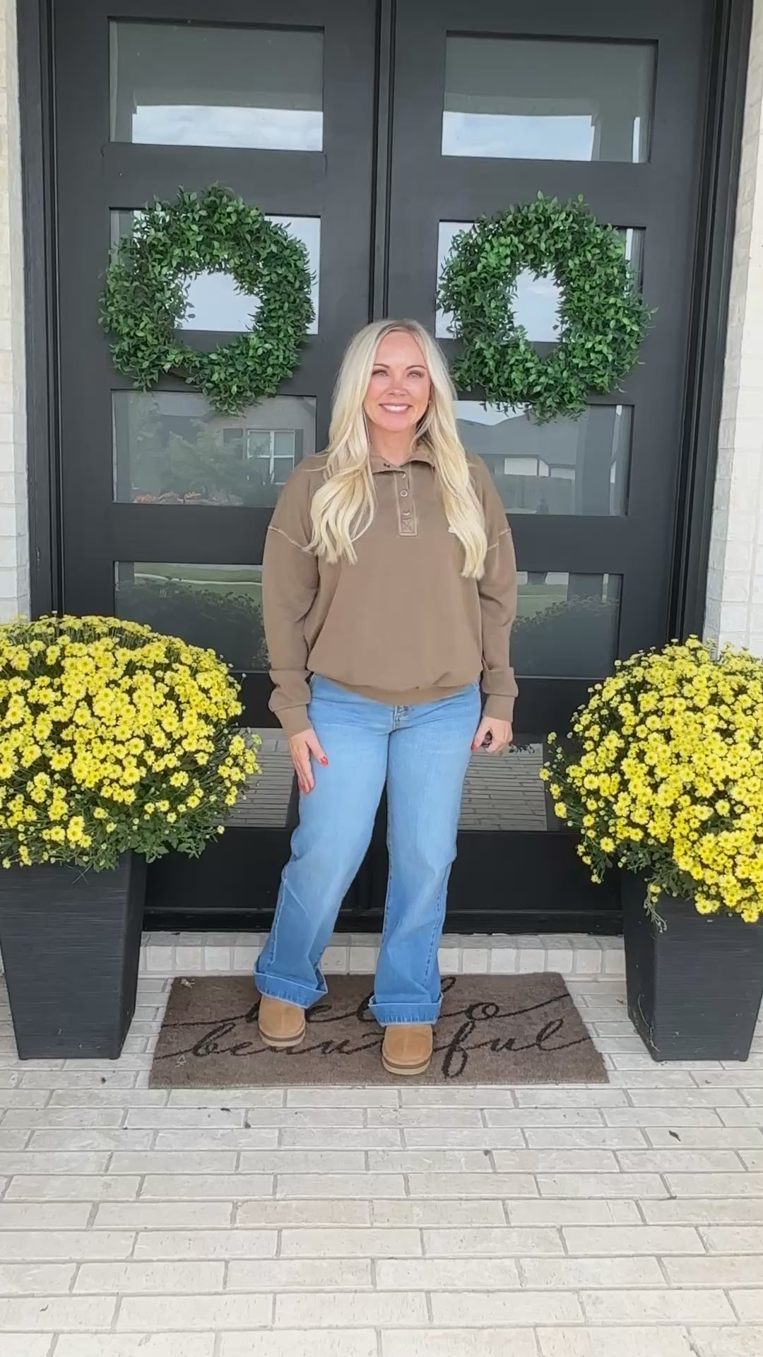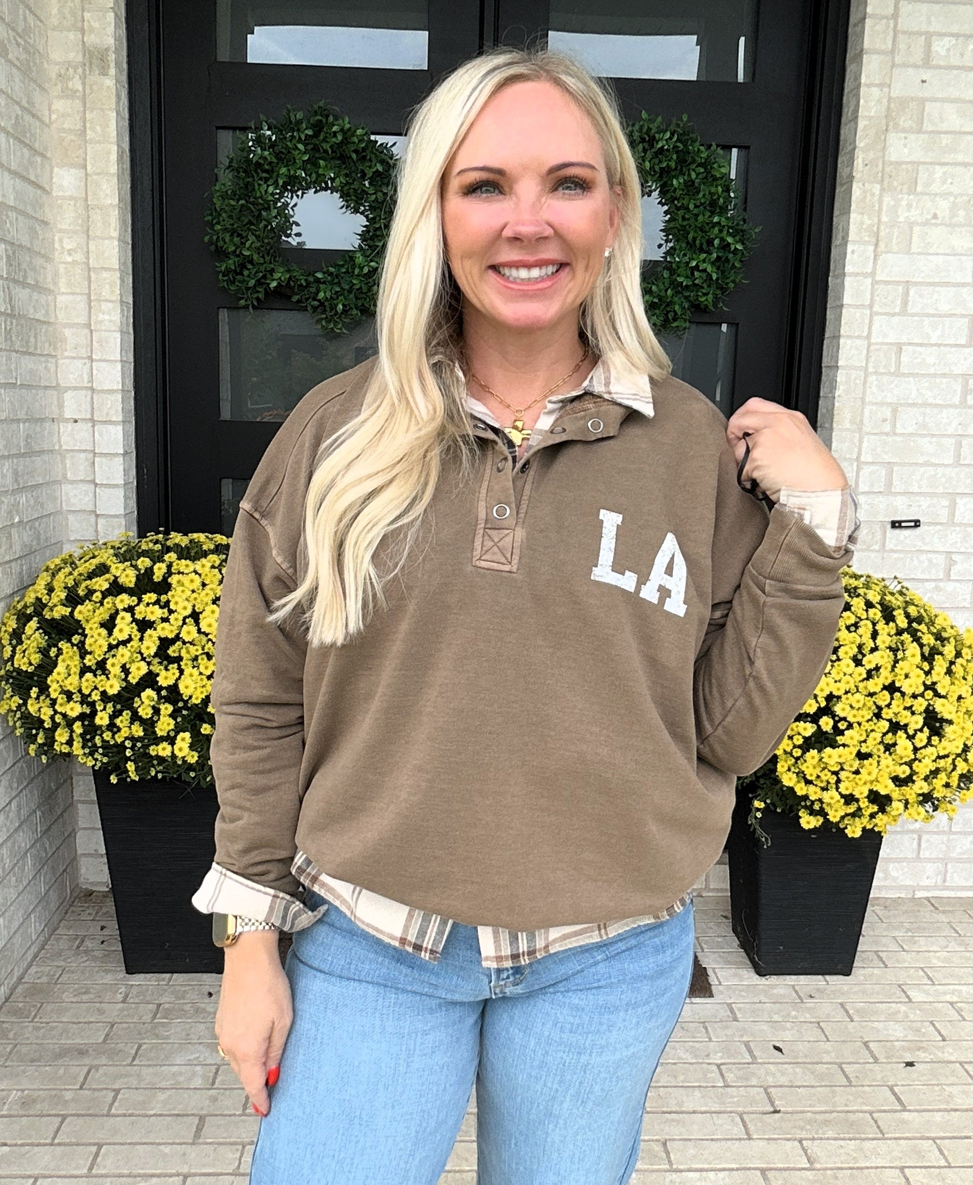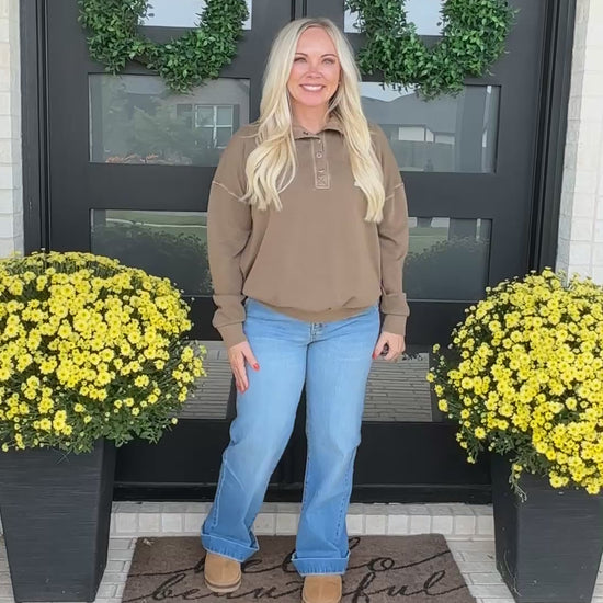 A rich latte-brown snap-neck sweatshirt with a relaxed, varsity-inspired fit. The soft cotton-spandex blend adds just the right amount of stretch for all-day comfort, while contrast details give it a subtle athletic edge.