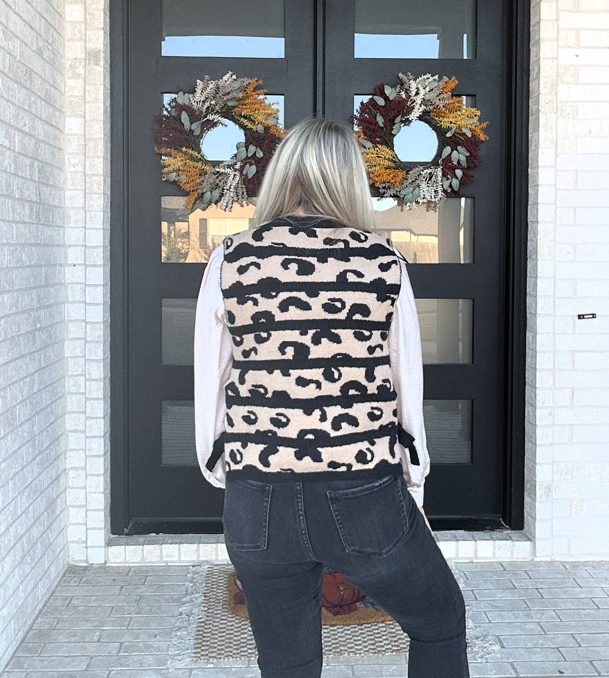 Meet your new layering obsession — our Leopard Tie-Side Sweater Vest. Featuring a soft knit feel, bold ivory-and-black leopard pattern, and adjustable side ties, this vest adds the perfect pop of wild-chic texture to any outfit. Style it over a fitted long sleeve, turtleneck, or basic tee for an effortless, elevated look that’s cozy and cool.
