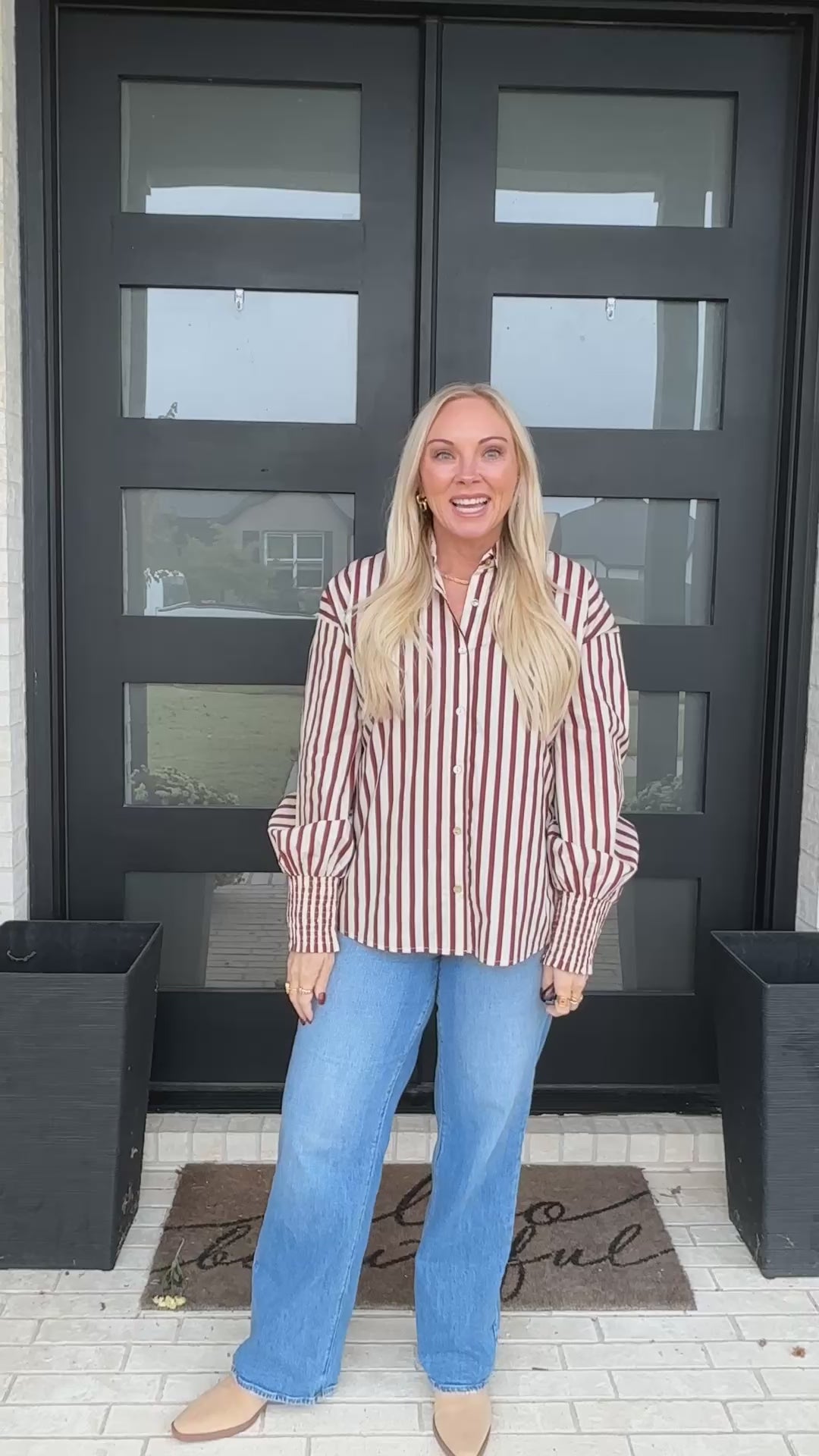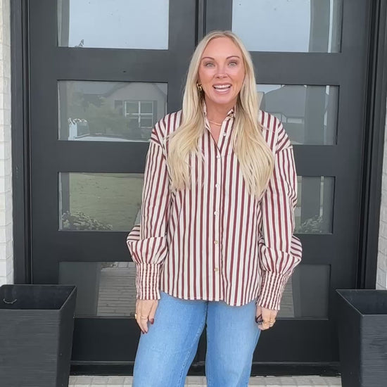 Timeless with a touch of fall charm — the Maple Stripe Button Down brings easy sophistication to your wardrobe. Featuring warm brown and cream stripes, this oversized top has a relaxed fit, front pocket, and button-down front that makes it perfect for layering or wearing solo. Pair it with denim or cords for a crisp, polished fall look that’s equal parts cozy and chic.