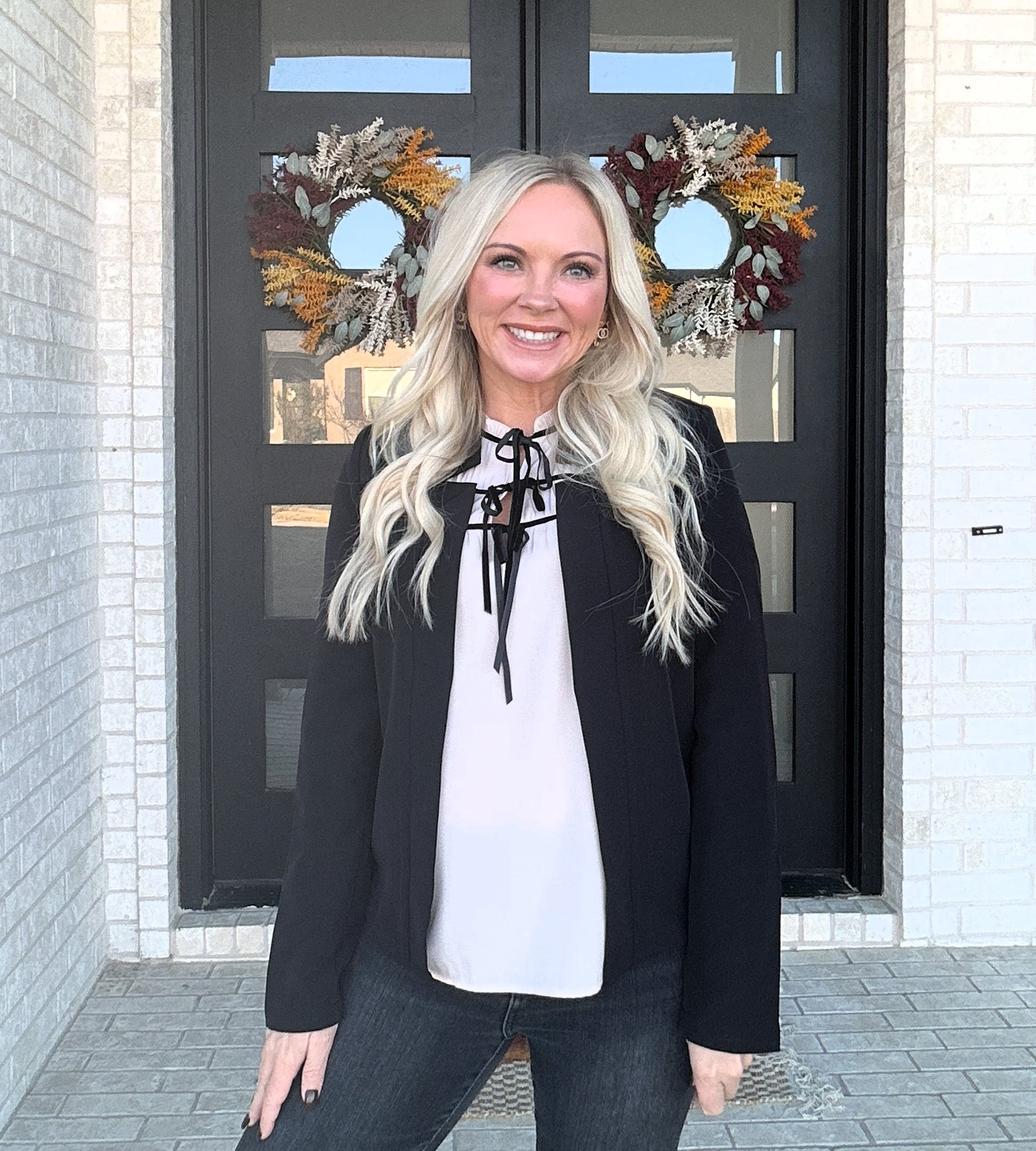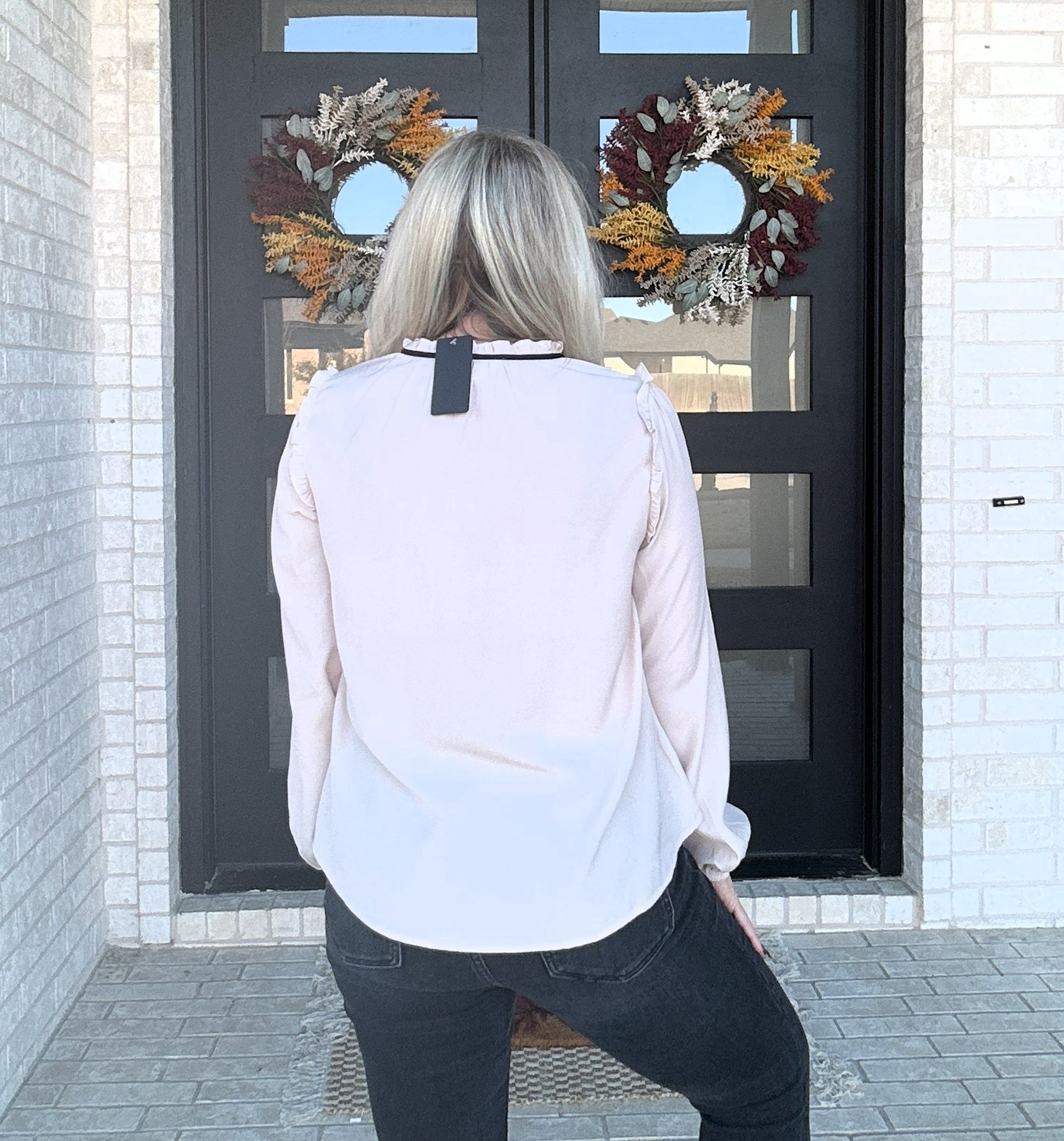 Elegantly feminine with a modern edge, the Black Tie Blouse features contrast ribbon trim, delicate ties, and softly gathered sleeves. The cream silhouette keeps it sweet, while the black accents add just the right amount of “smoke” sophistication.
