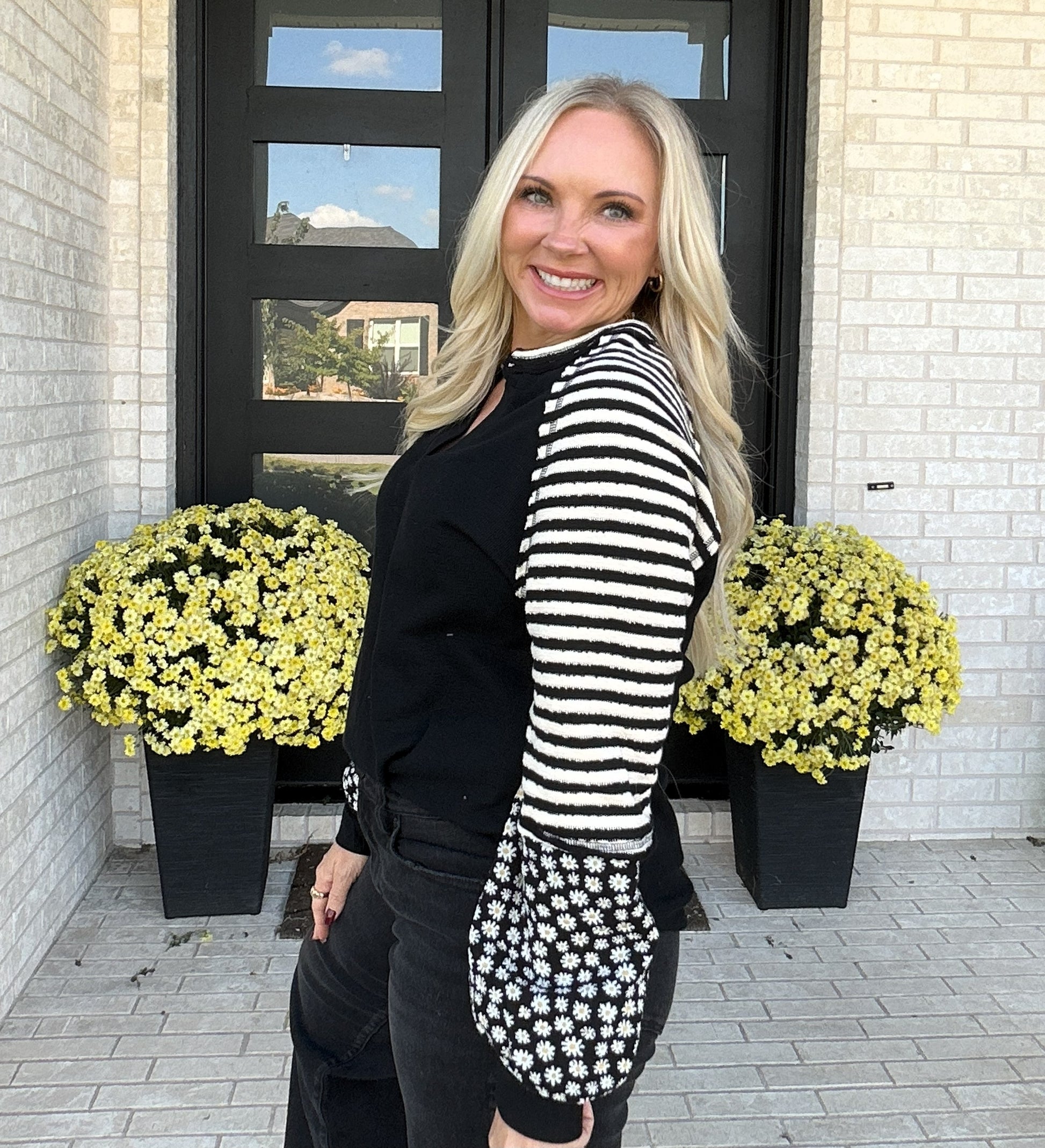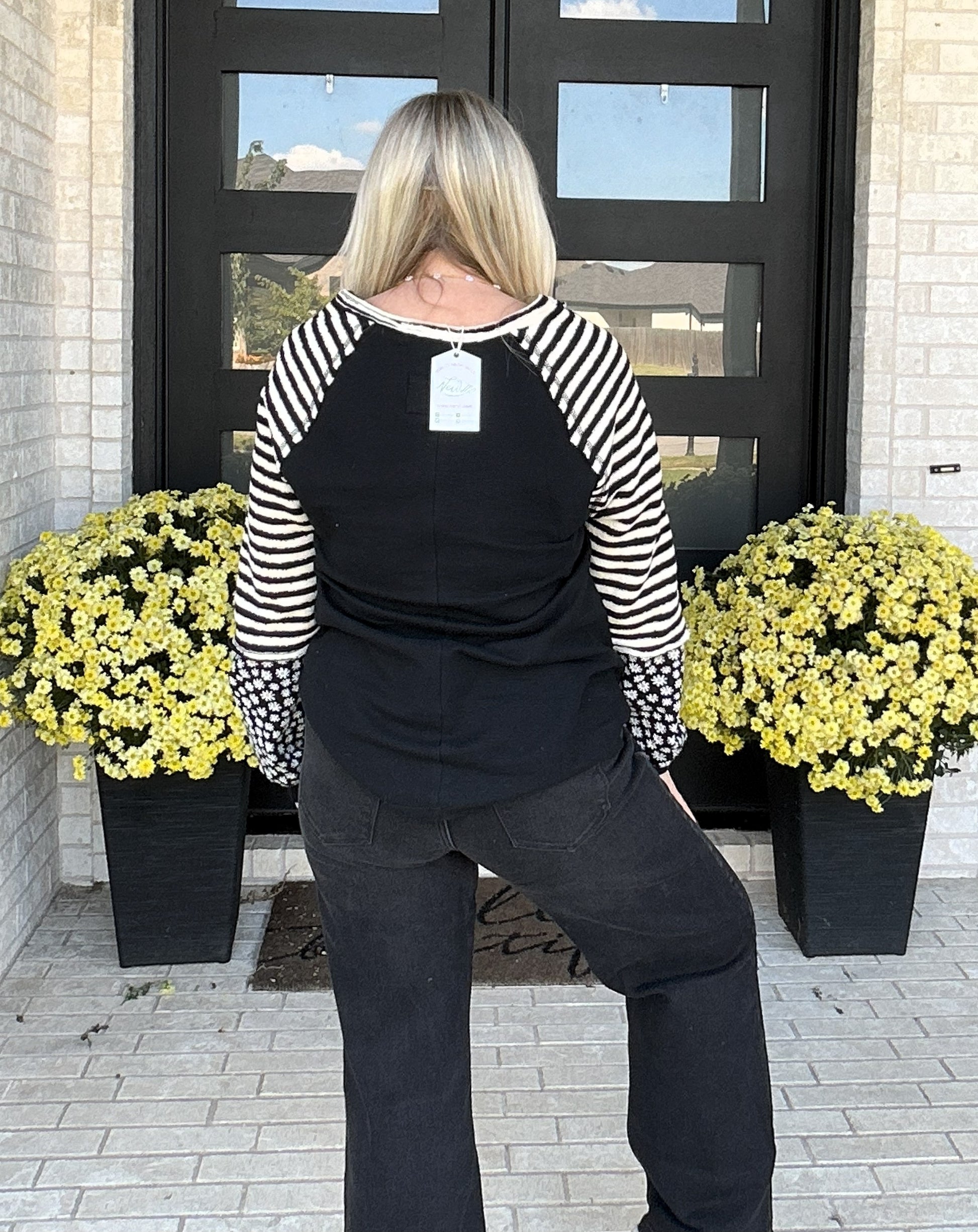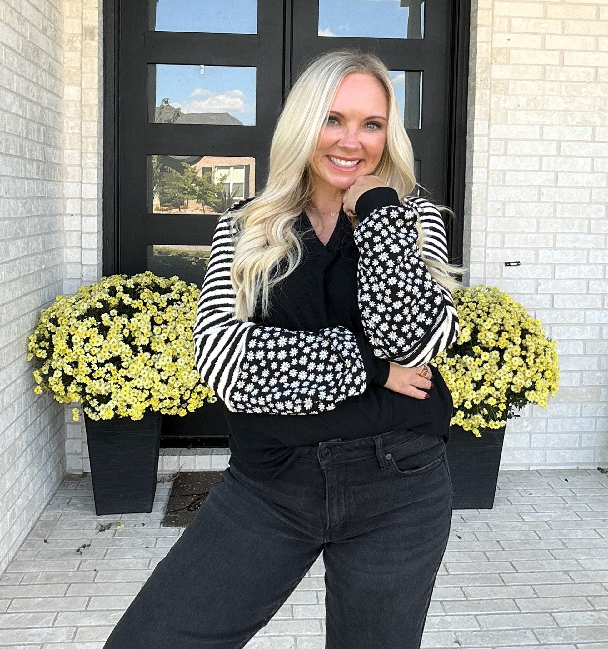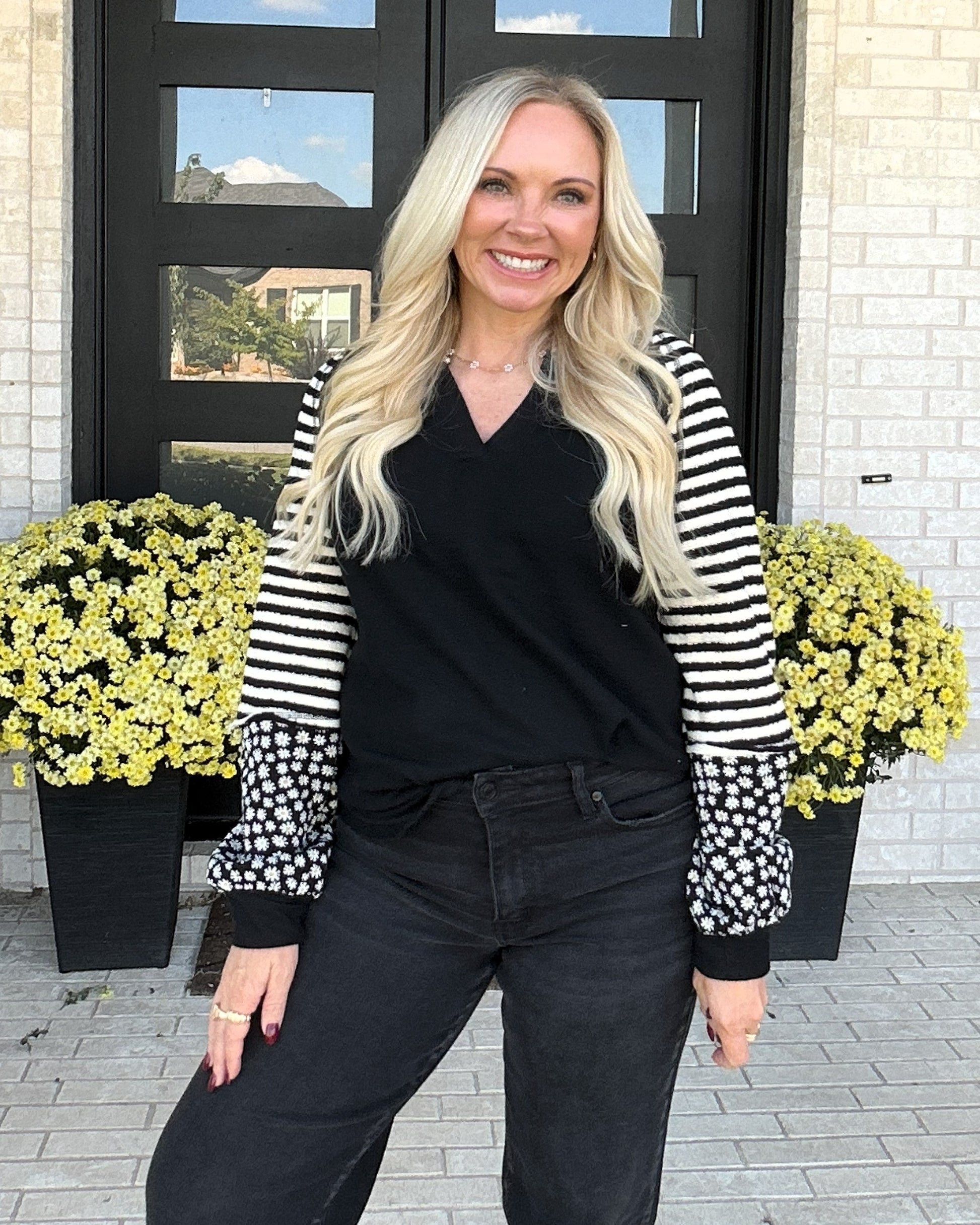 Say hello to your new favorite statement knit. The Mixed Signals Top brings together stripes, florals, and a relaxed fit for a look that’s equal parts bold and easy. With a soft casual feel and standout sleeves, it’s the perfect mix of pattern play and everyday comfort.
