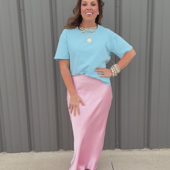 Meet the skirt that does all the work for you. The Pink Theory Midi Skirt features a silky satin finish with a flattering bias cut that skims the body in all the right places. The elastic waistband keeps it comfortable and easy to wear, while the soft drape gives it that effortless, polished look.