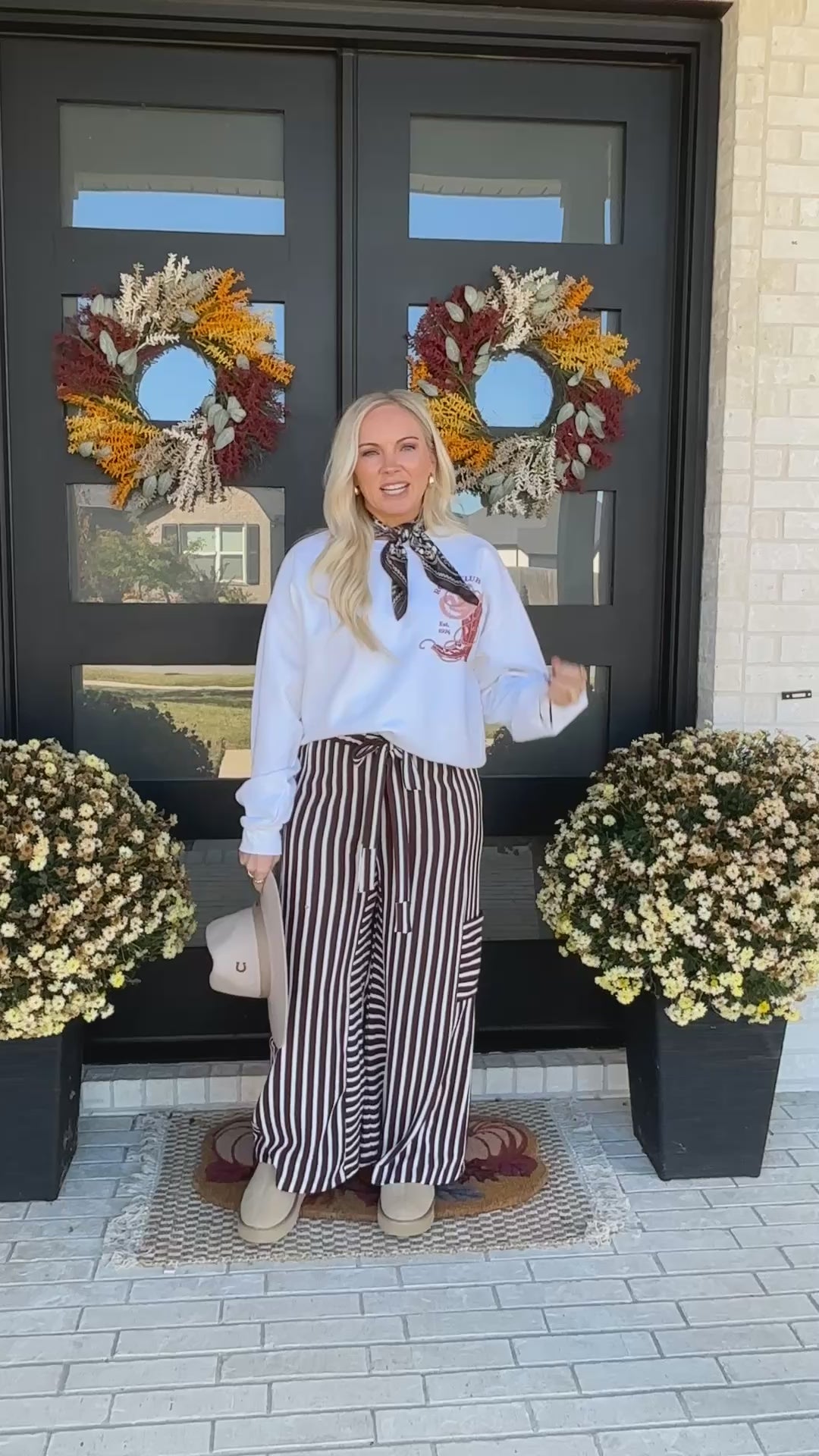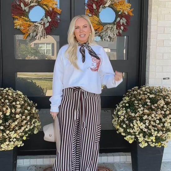 Add a touch of western charm with the Prairie Stripe Wide-Leg Pants — effortlessly relaxed and endlessly flattering. Featuring a bold stripe pattern, soft stretch fabric, and an easy elastic waistband with a tie detail, these flowy pants move with you from coffee runs to cozy evenings. Complete with side pockets and a breezy fit, they pair perfectly with graphic tops, knits, or your favorite booties from the Wild Sage Collection.