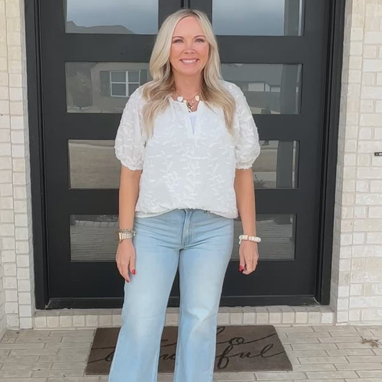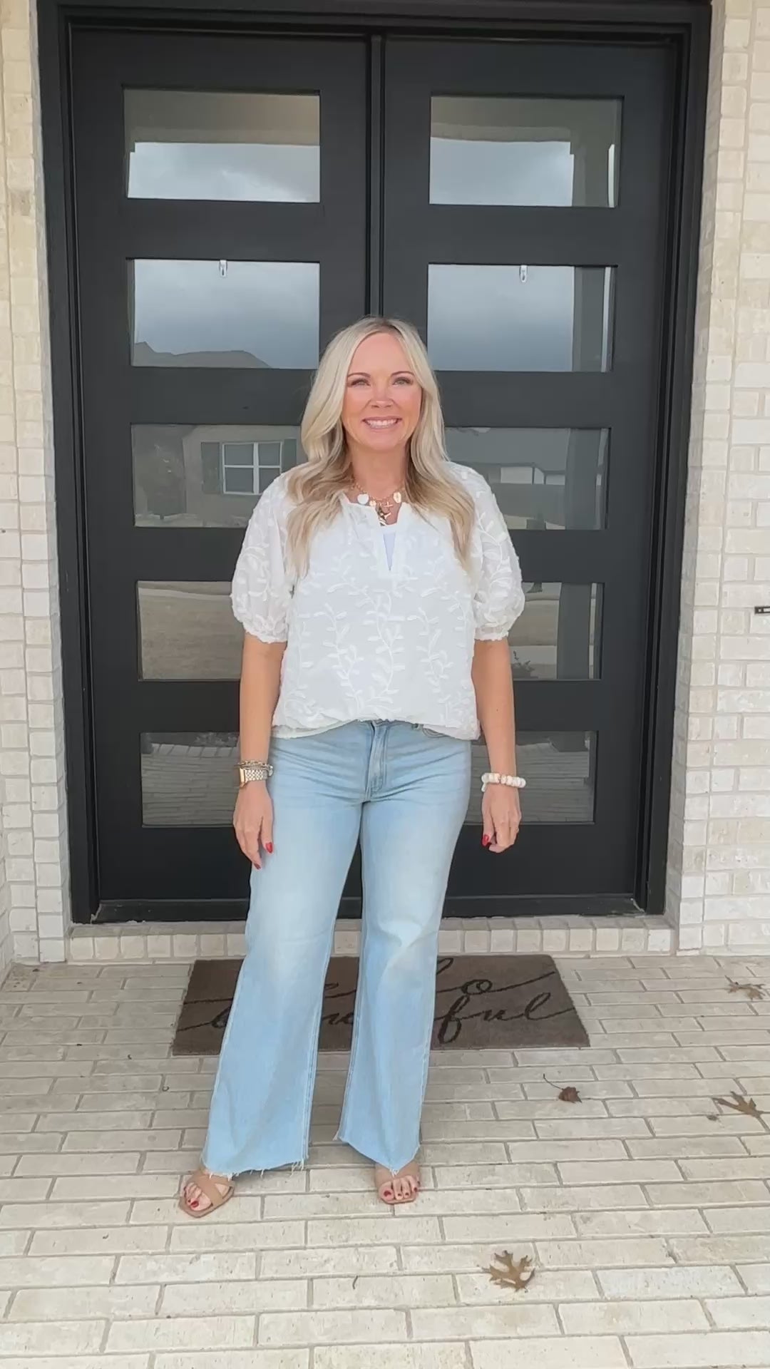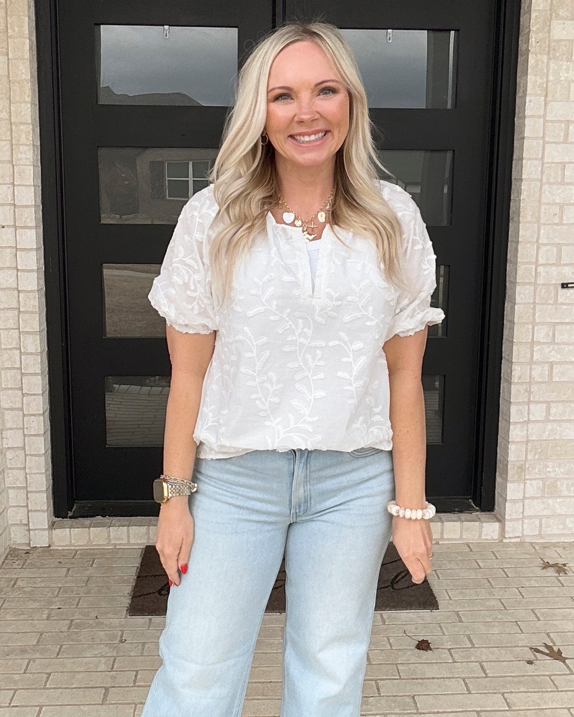 Light, feminine, and effortlessly polished, the Seaside Embroidered Blouse is a perfect blend of relaxed coastal style and delicate detail. Featuring soft cotton fabric with subtle embroidered patterns throughout, this blouse is designed with a flattering split neckline and airy sleeves for an easy, everyday fit. Pair it with your favorite denim for a timeless look that feels both fresh and effortless.