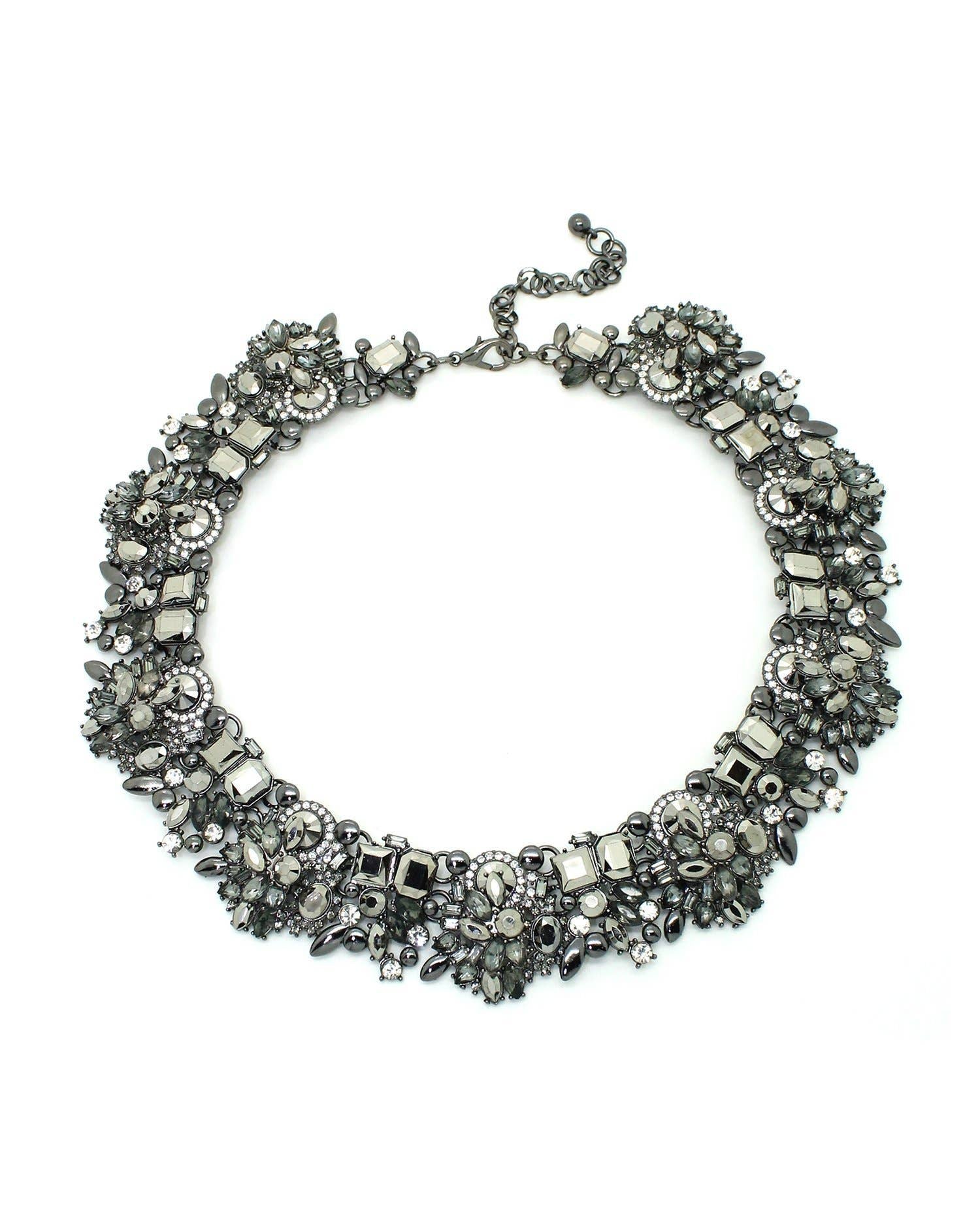 Bold, glamorous, and made to be seen. The Midnight Soirée Necklace features a collar of multi-cut charcoal crystals set in a deep silver tone for a dramatic, elegant finish. Perfect for holiday parties, winter weddings, or a night out where you want to shine — this statement piece brings instant luxury to any look.