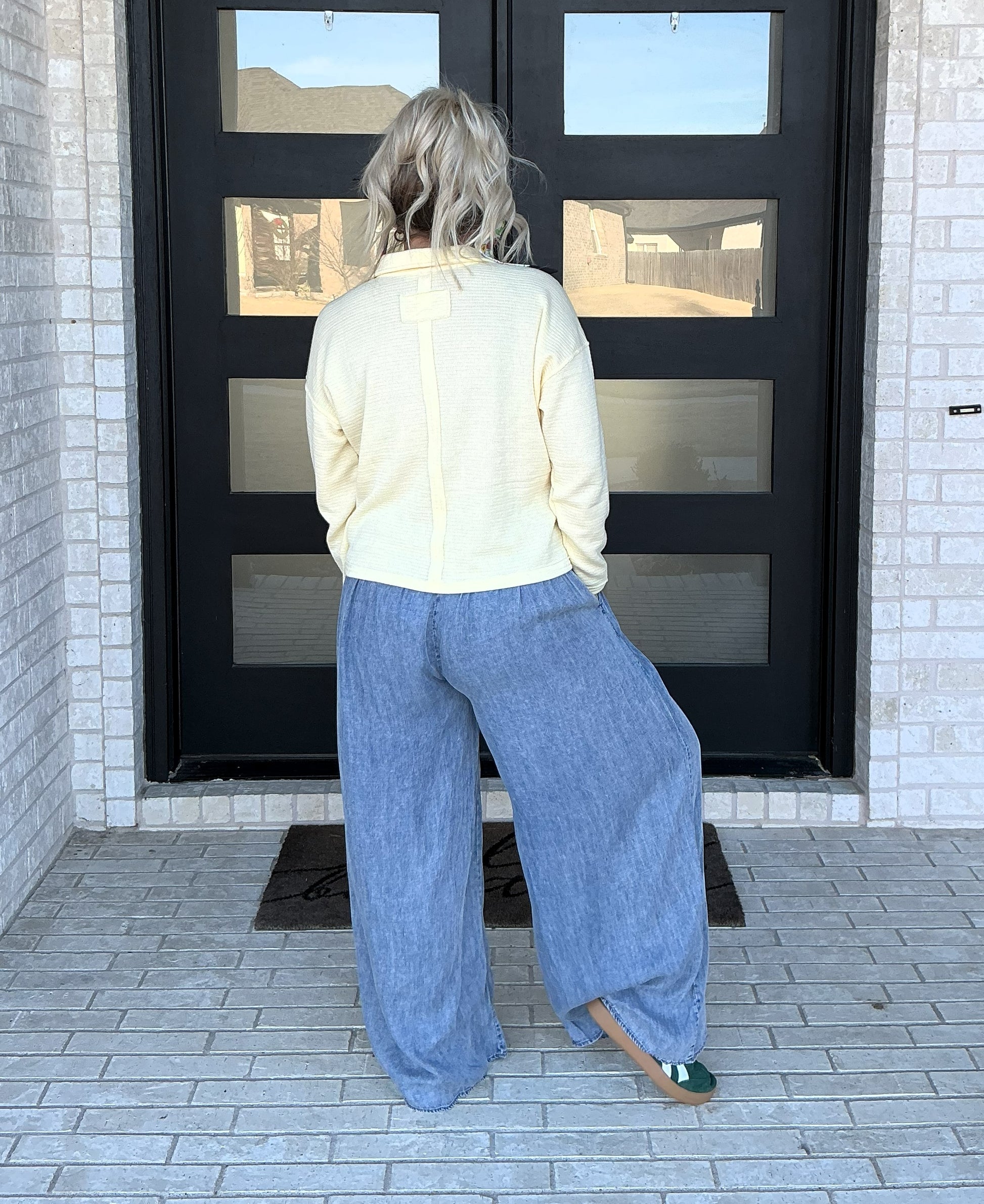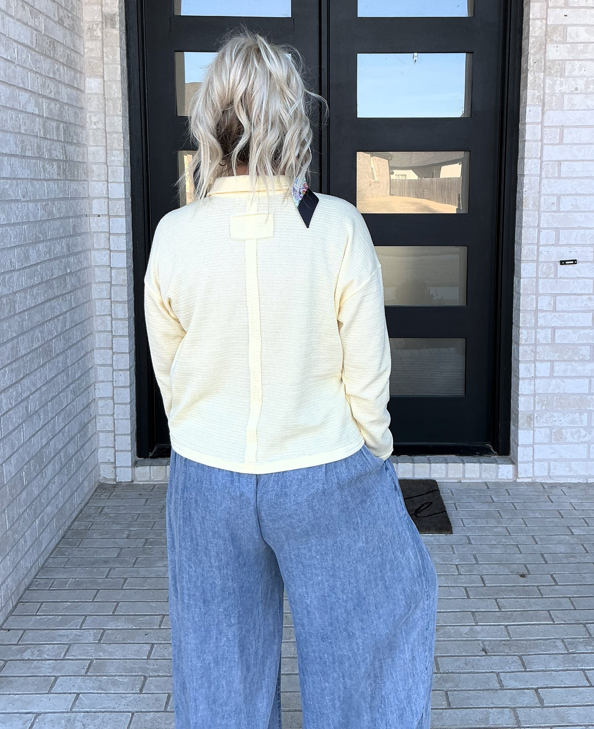 An easy, feel-good staple with a polished touch. This soft yellow knit top features a relaxed silhouette with a subtle collar and split neckline, making it perfect for effortless everyday wear. Lightweight with just the right amount of stretch, it pairs beautifully with denim, white pants, or layered under a jacket for transitional days.