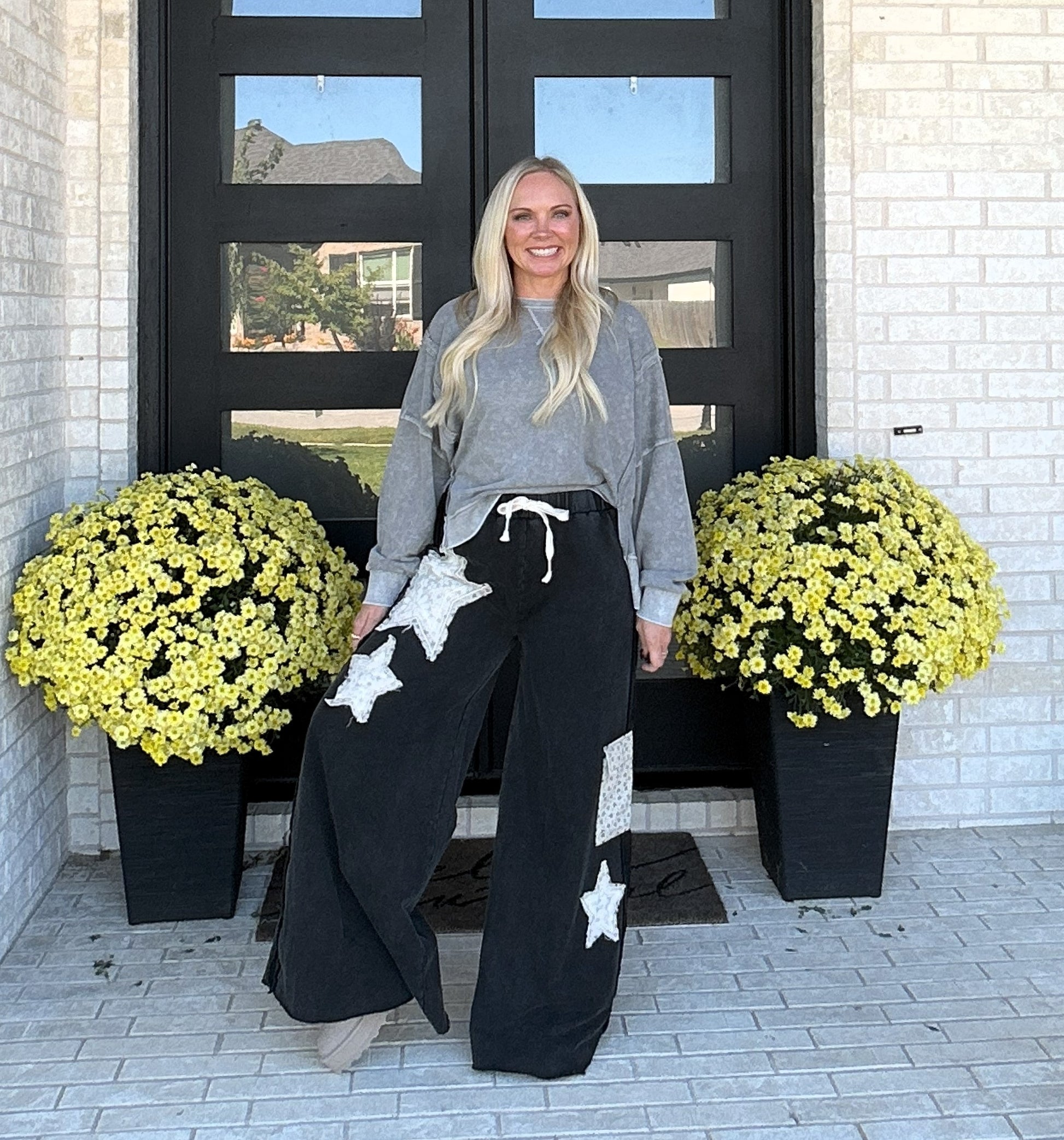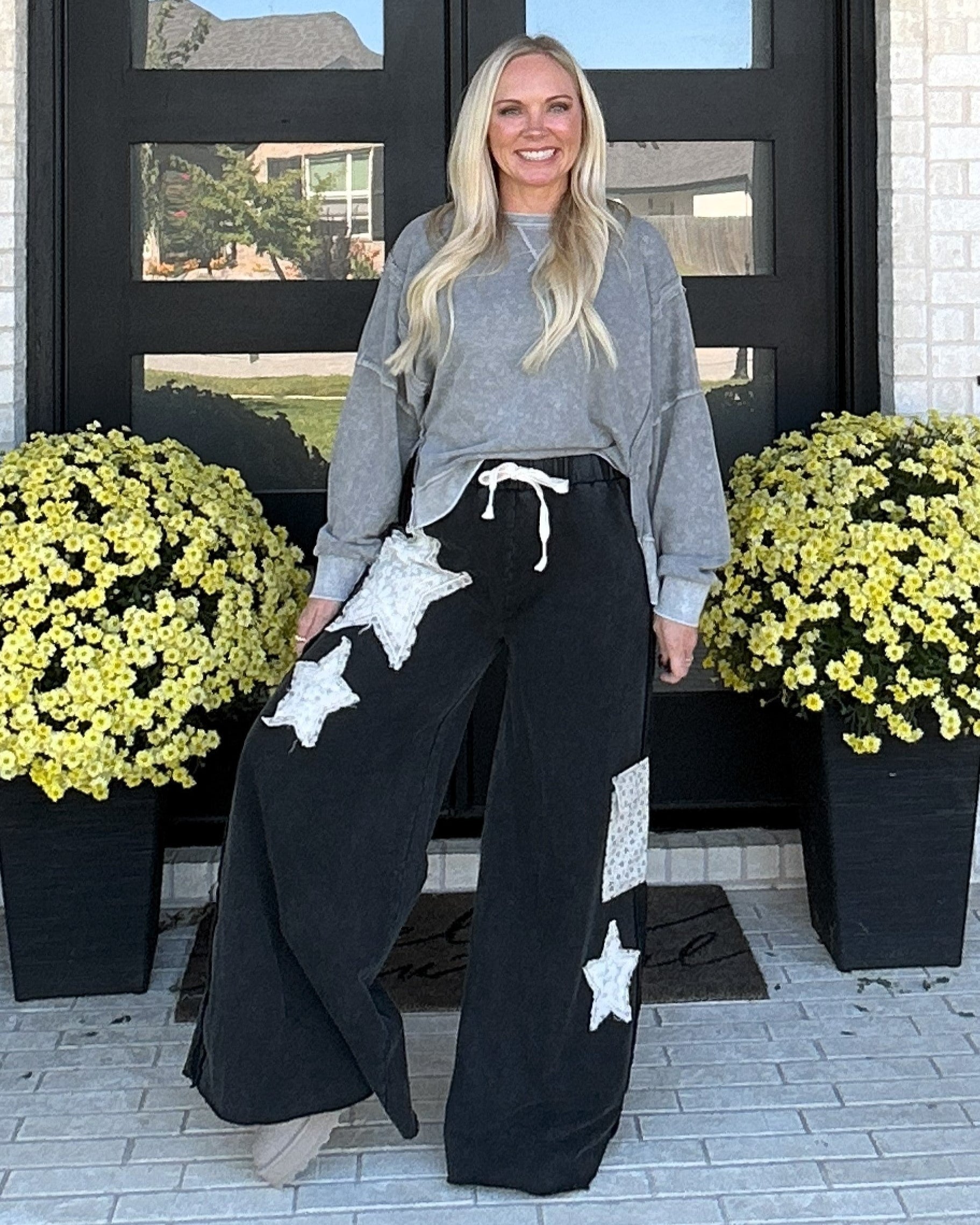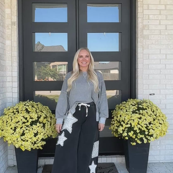 Meet your new off-duty favorite — the Starstruck Lounge Pants. Crafted from soft French terry with a vintage-washed finish, these wide-leg pants bring a touch of personality with bold star patches, lace accents, and raw-edge detailing. The relaxed silhouette and elastic drawstring waistband make them an effortless choice for cozy days, coffee runs, or laid-back weekends.