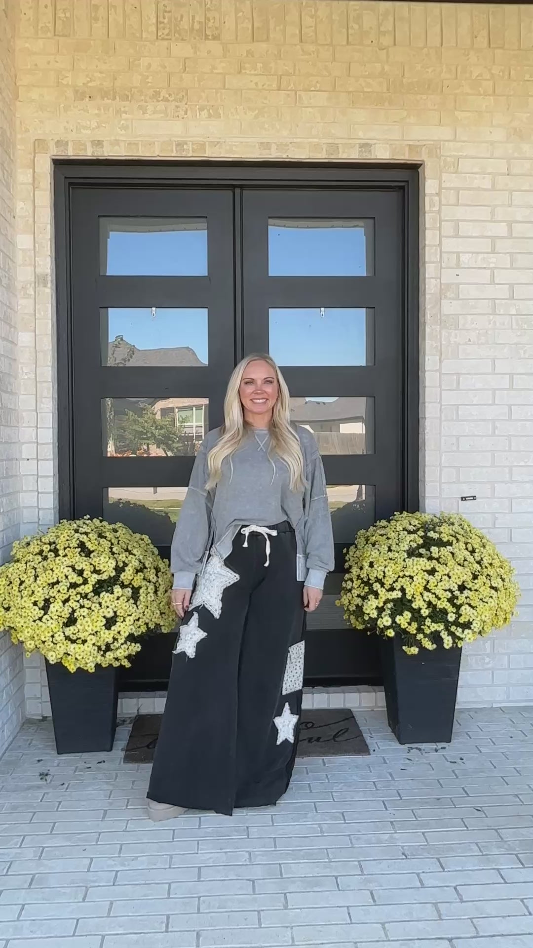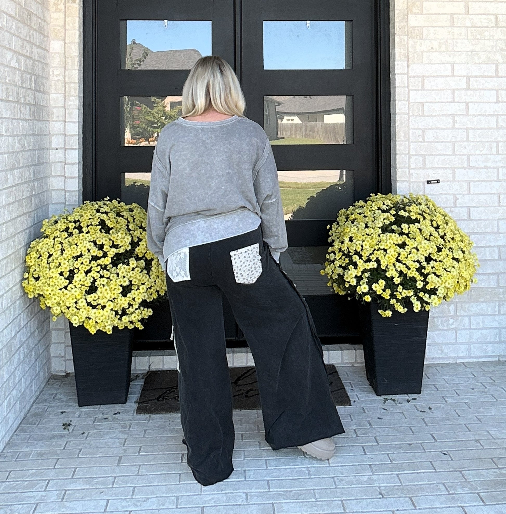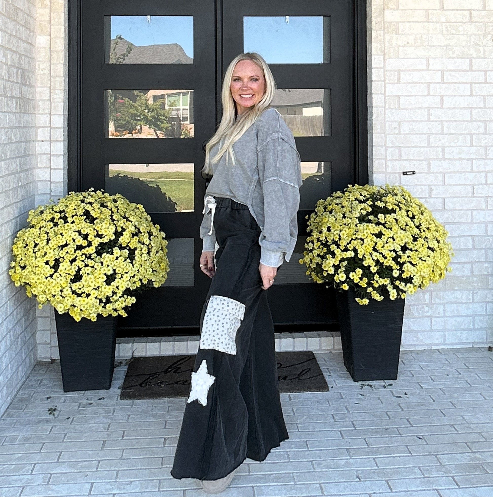 Meet your new off-duty favorite — the Starstruck Lounge Pants. Crafted from soft French terry with a vintage-washed finish, these wide-leg pants bring a touch of personality with bold star patches, lace accents, and raw-edge detailing. The relaxed silhouette and elastic drawstring waistband make them an effortless choice for cozy days, coffee runs, or laid-back weekends.