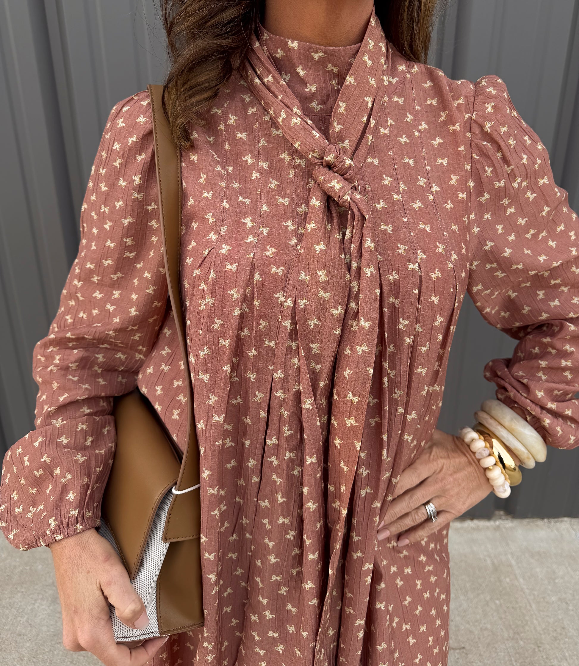 Featuring a soft allover print, a flattering relaxed fit, and a beautiful tie-neck detail you can wear knotted or loose for two different looks. The long sleeves with subtle volume add just the right touch of elegance.