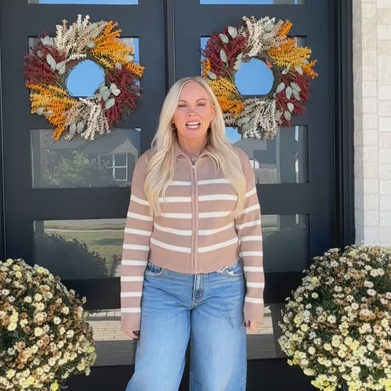Elevate your everyday with The Amberline Sweater, where cozy meets polished. Designed with warm camel and cream stripes, this ribbed zip-up knit offers the perfect blend of comfort and sophistication. The structured fit and mock neckline give it a modern, sporty edge — ideal for layering over your favorite basics or pairing with denim for a sleek, seasonal look. Whether you’re heading to brunch or a weekend gathering, it’s an instant wardrobe staple.
