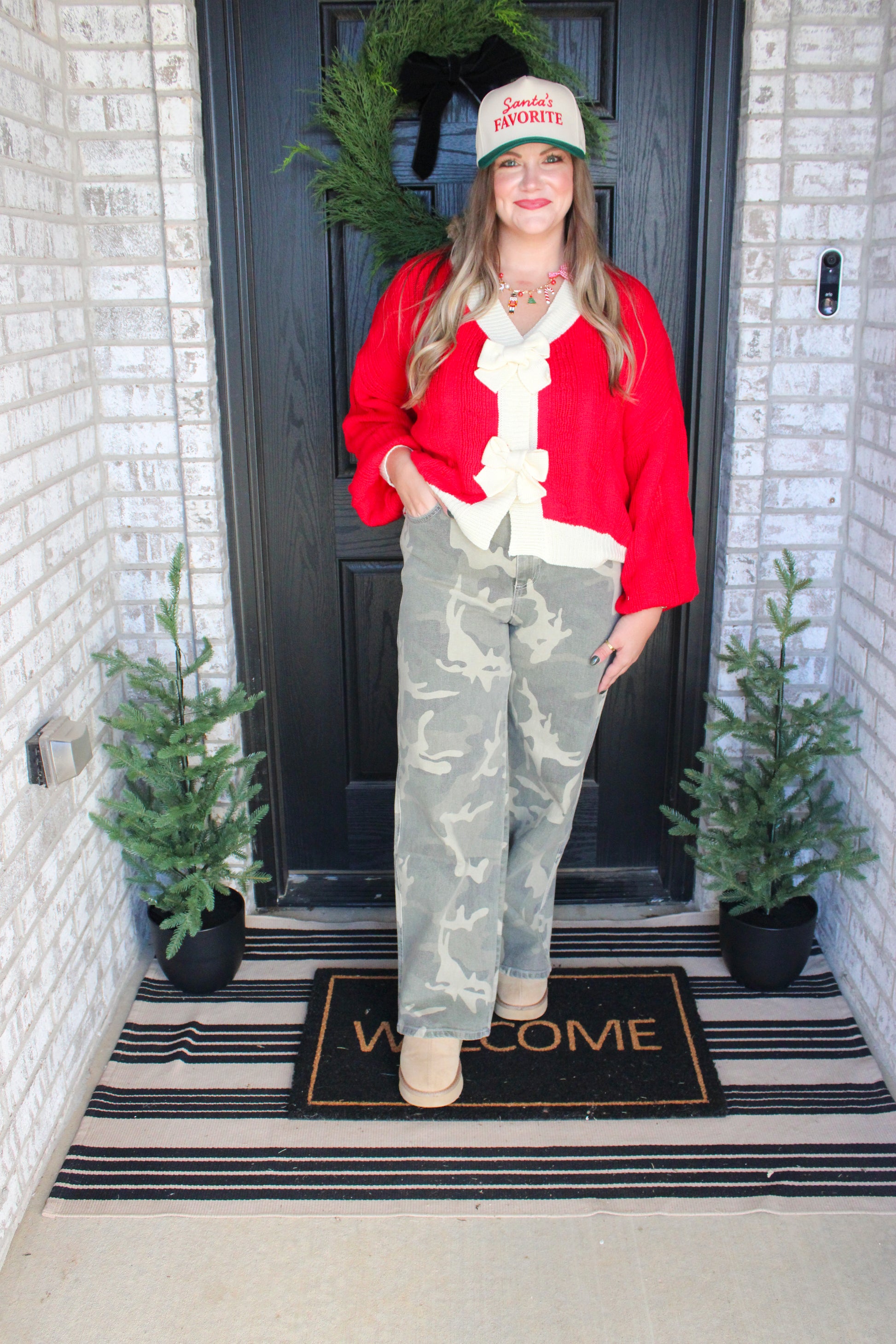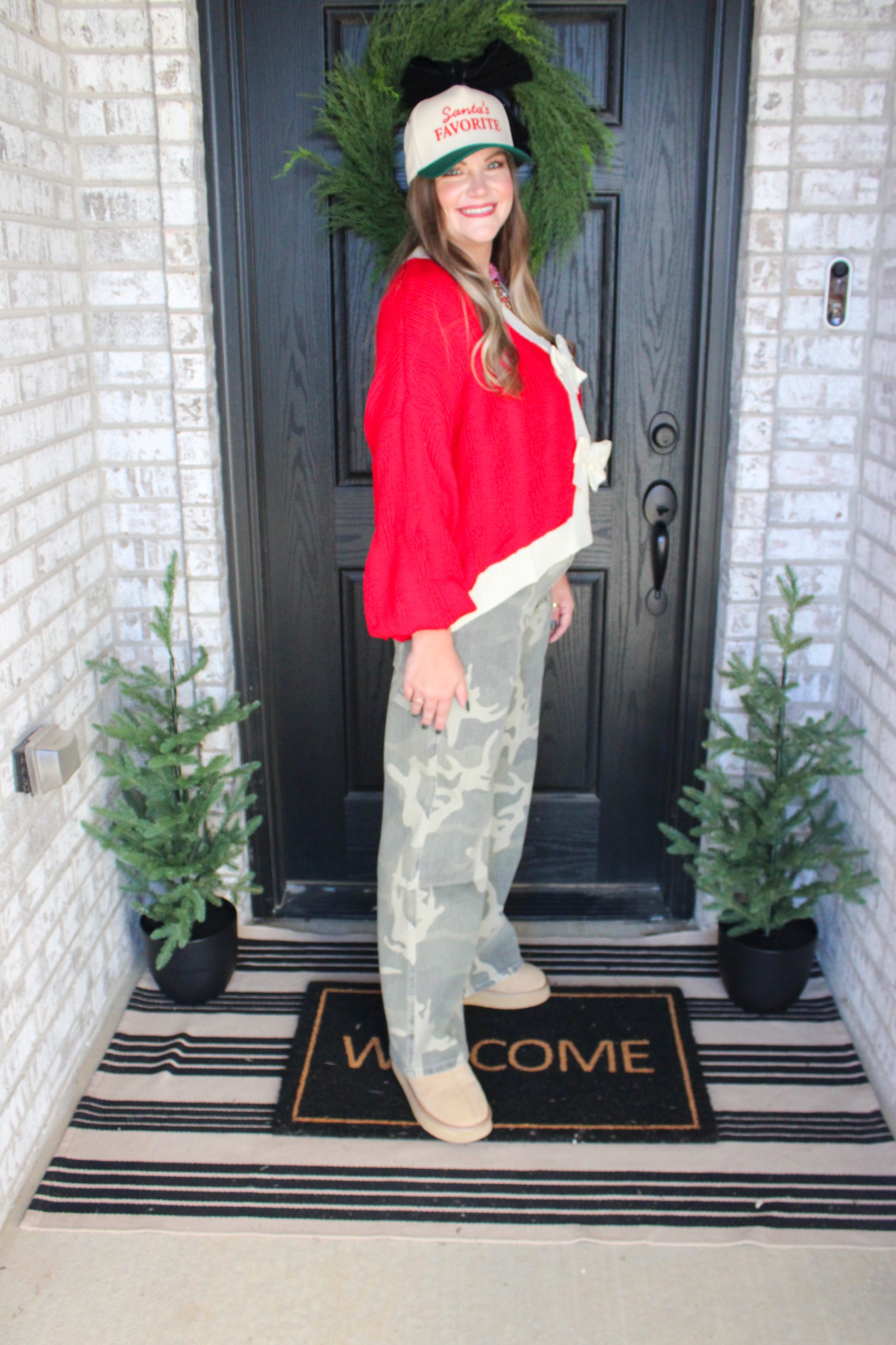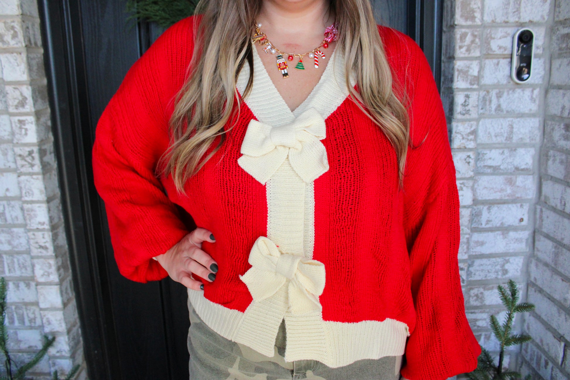 Cozy with a touch of charm. The Bow & Toast Cardigan features a soft knit body with oversized bow details down the front for the cutest gift-wrapped finish. Available in rich holiday red and warm oat, it’s the perfect throw-on piece for cocoa runs, festive gatherings, or nights by the tree. Style it with denim, satin skirts, or leggings for an instant seasonal mood.