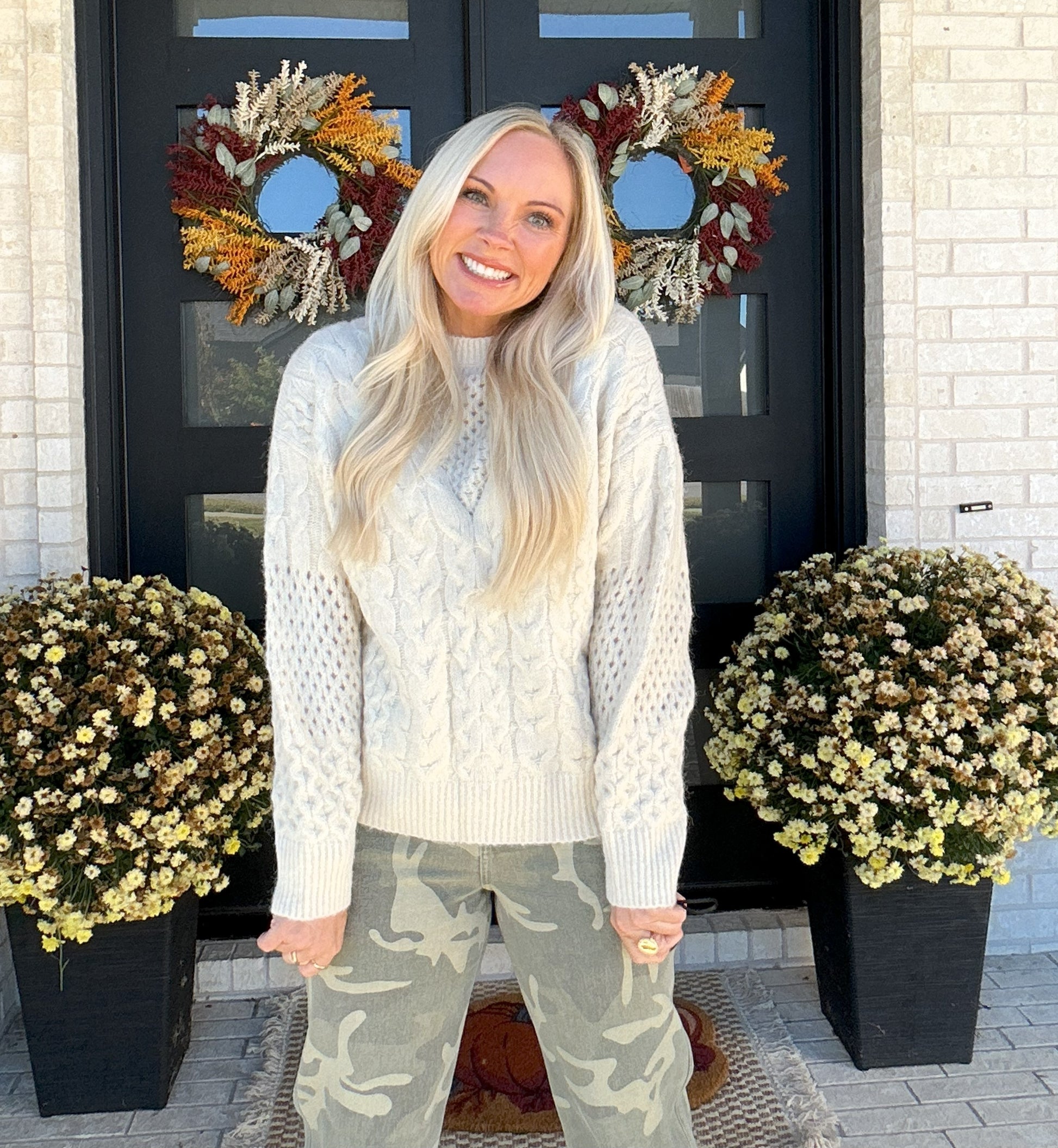 Soft, timeless, and effortlessly feminine — The Candlewick Sweater is the essence of cozy refinement. Designed with an intricate cable knit and subtle openwork detailing, this cream pullover brings warmth and texture to any outfit. Its relaxed silhouette and classic neckline make it perfect for both laid-back lounging and seasonal gatherings. Pair it with tailored trousers, denim, or a mini skirt for an effortlessly elevated fall look.
