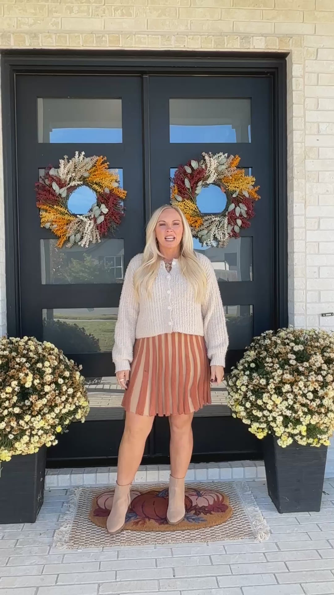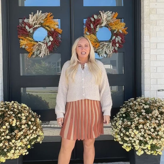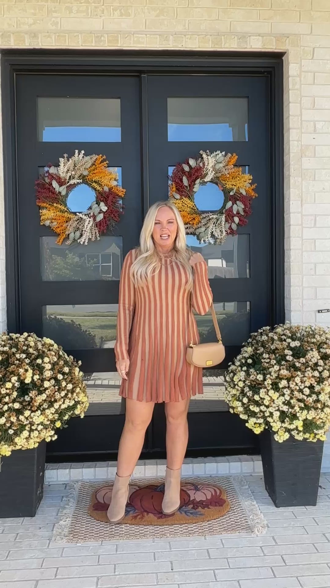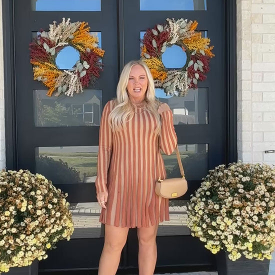 Meet The Cider Lane Dress — a striped knit mini that captures the spirit of the season. With warm caramel and golden tones woven into its ribbed fabric, this flattering silhouette brings both comfort and charm. Designed with a classic round neckline and long sleeves, it flows effortlessly with every step, making it perfect for holiday gatherings, coffee dates, or evenings by the fire. Pair it with tall boots and gold accents for a polished autumn look.