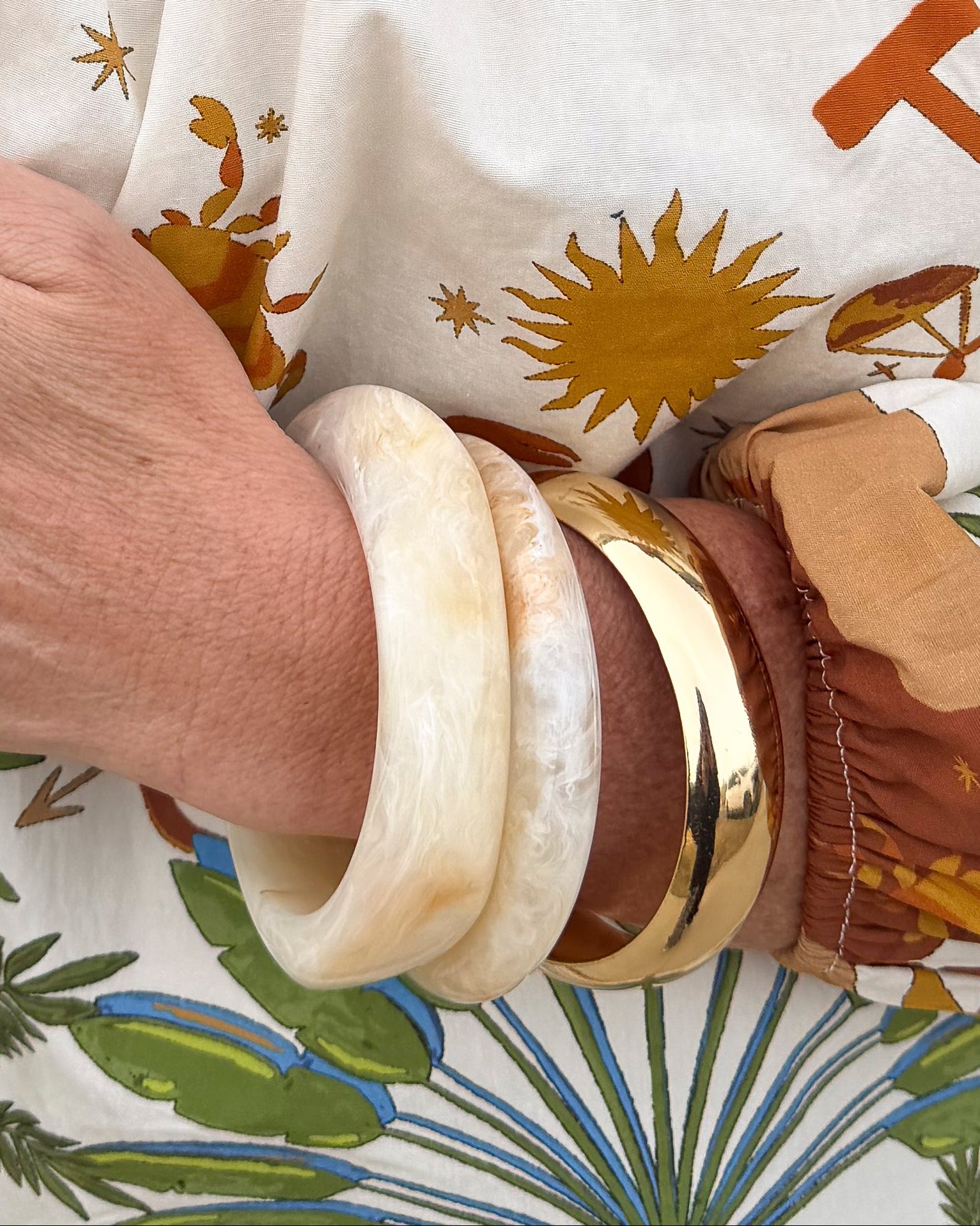 Inspired by timeless elegance, the Quiet Luxury Stack pairs soft ivory marbling with a bold gold dome bracelet for a balanced, sculptural look.