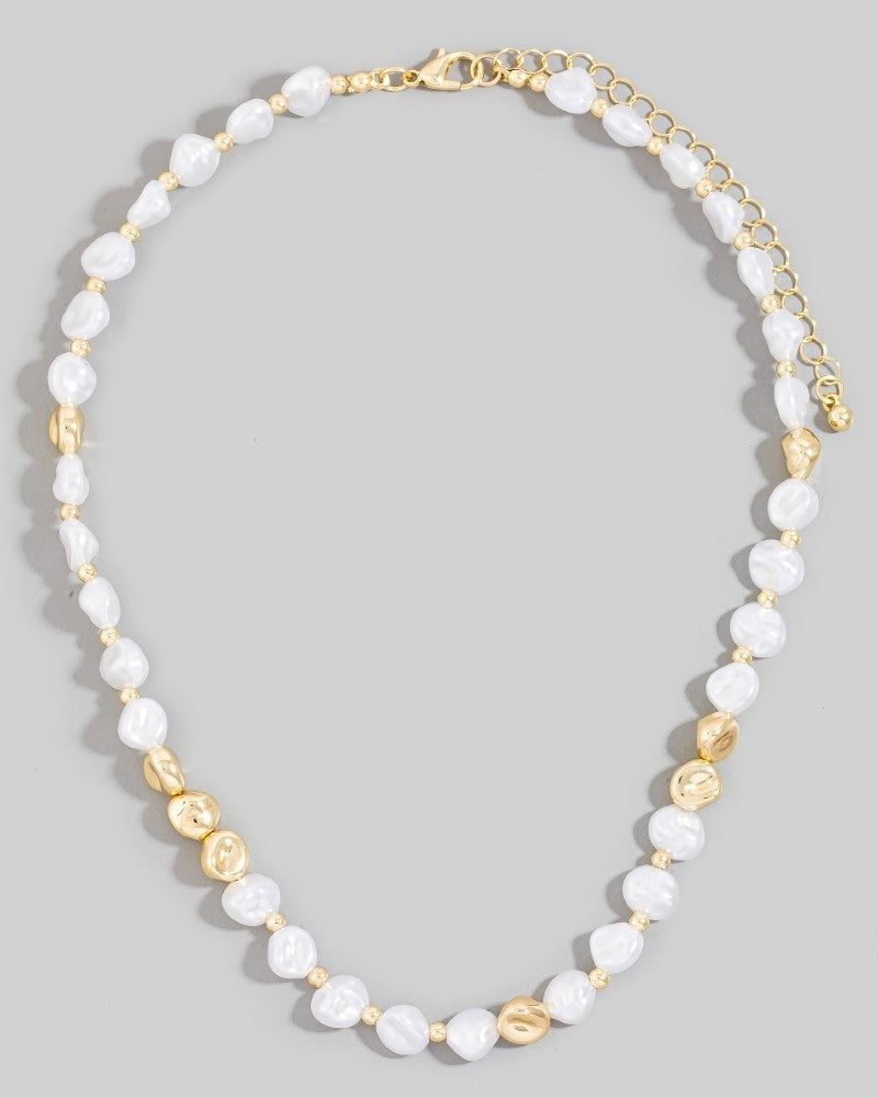 Softly sculpted pearls meet subtle metallic accents in the Shoreline Whisper Necklace. Designed with organic, irregular pearl beads and delicate gold detailing, this piece feels modern, refined, and effortlessly timeless.