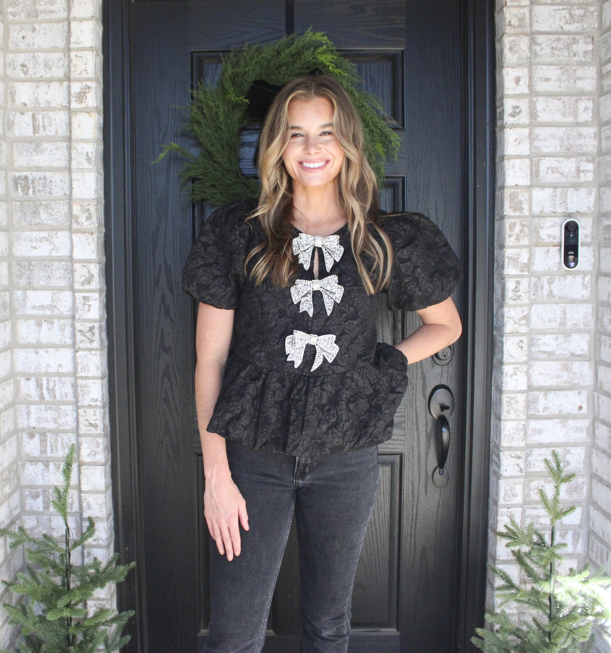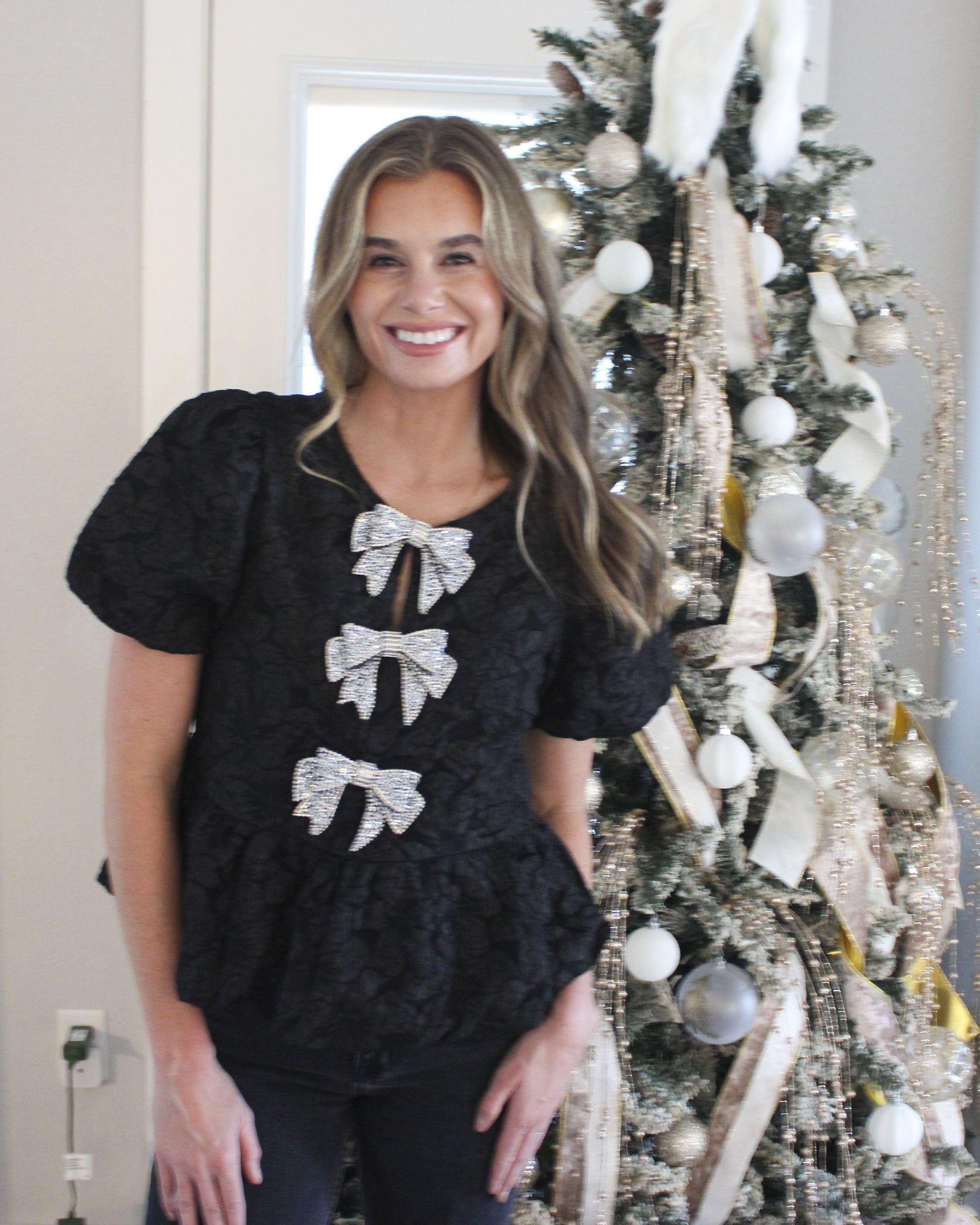 All eyes on you in The Spark & Shine Top — an unforgettable piece that mixes classic texture with a dose of holiday glam. Designed in a rich jacquard fabric, it features three shimmering rhinestone bows down the front, voluminous bubble sleeves, and a flattering peplum silhouette. Available in classic black and deep burgundy, it’s the perfect top for festive dinners, night-out moments, or holiday soirées.