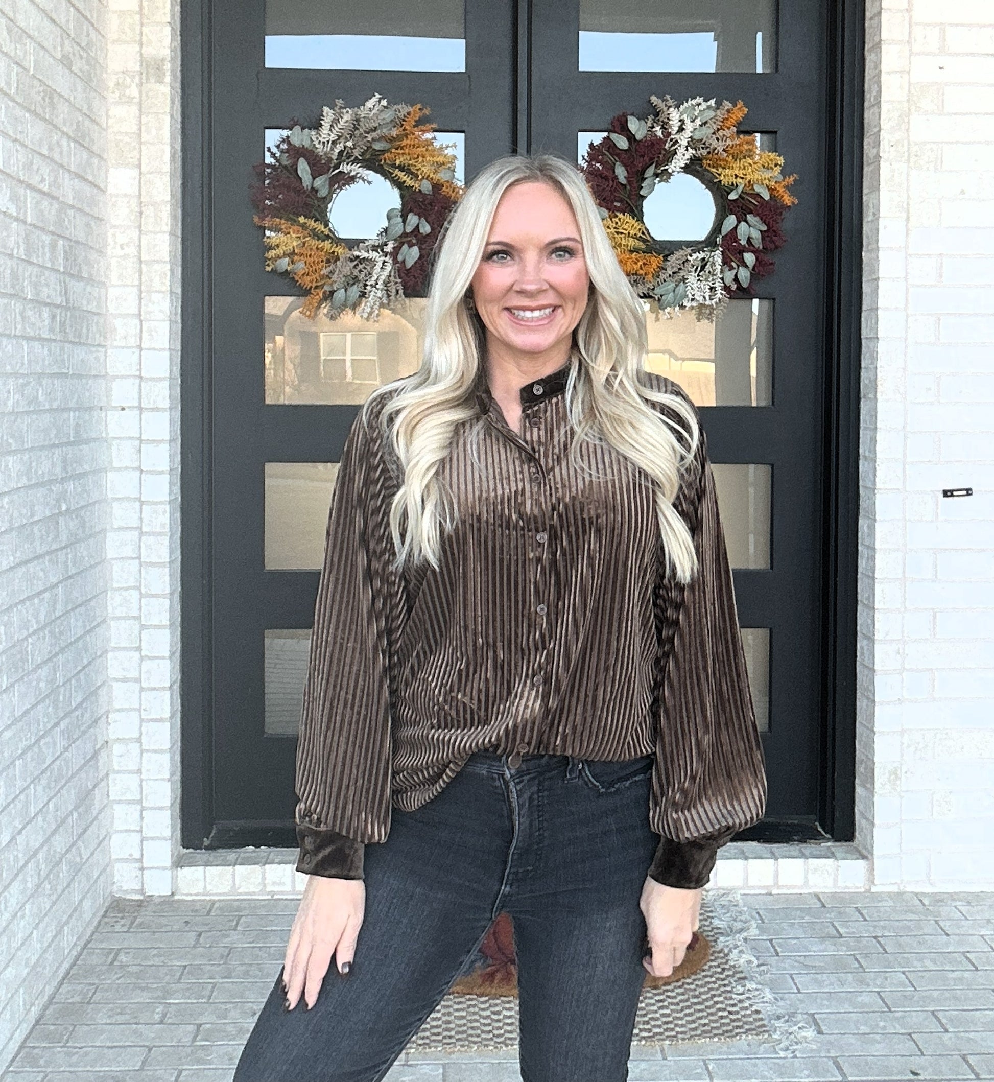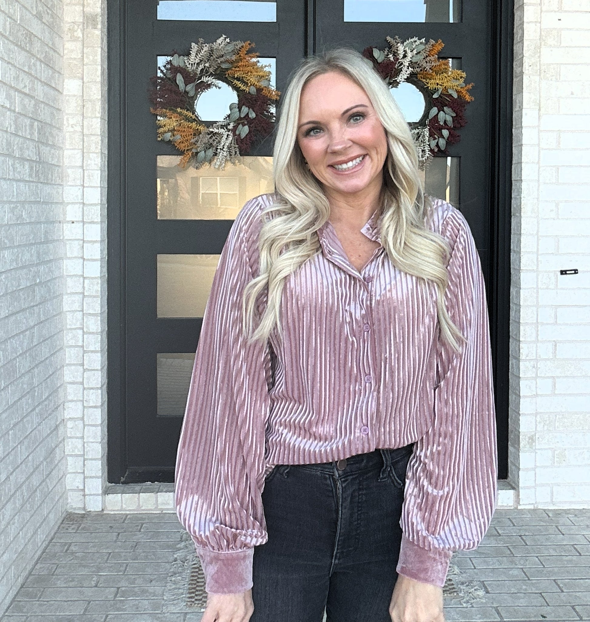 This blouse has been waiting for the perfect moment to make its debut, and it's finally here. Crafted from luxe velvet with a striped pattern, it has a band neck, long sleeves with buttoned cuffs and a classic button-down silhouette. Model is wearing a size medium.
