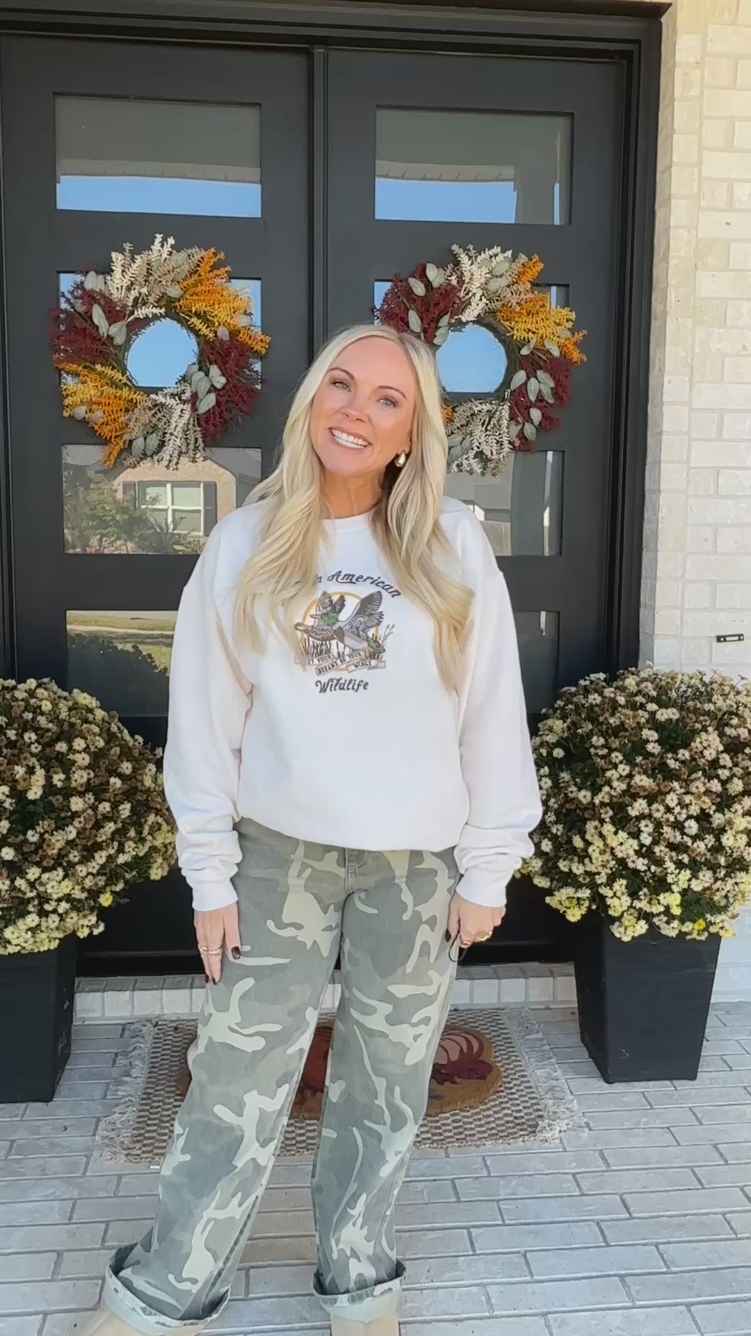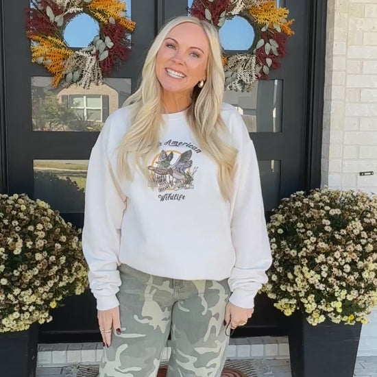 The perfect blend of cozy comfort and vintage-inspired charm. The Wild North Embroidered Crew features a soft, oversized fit and detailed wildlife embroidery that brings a nostalgic, outdoorsy feel to your look. Designed in a creamy natural tone with a relaxed silhouette, this sweatshirt layers effortlessly over denim, leggings, or your favorite joggers.